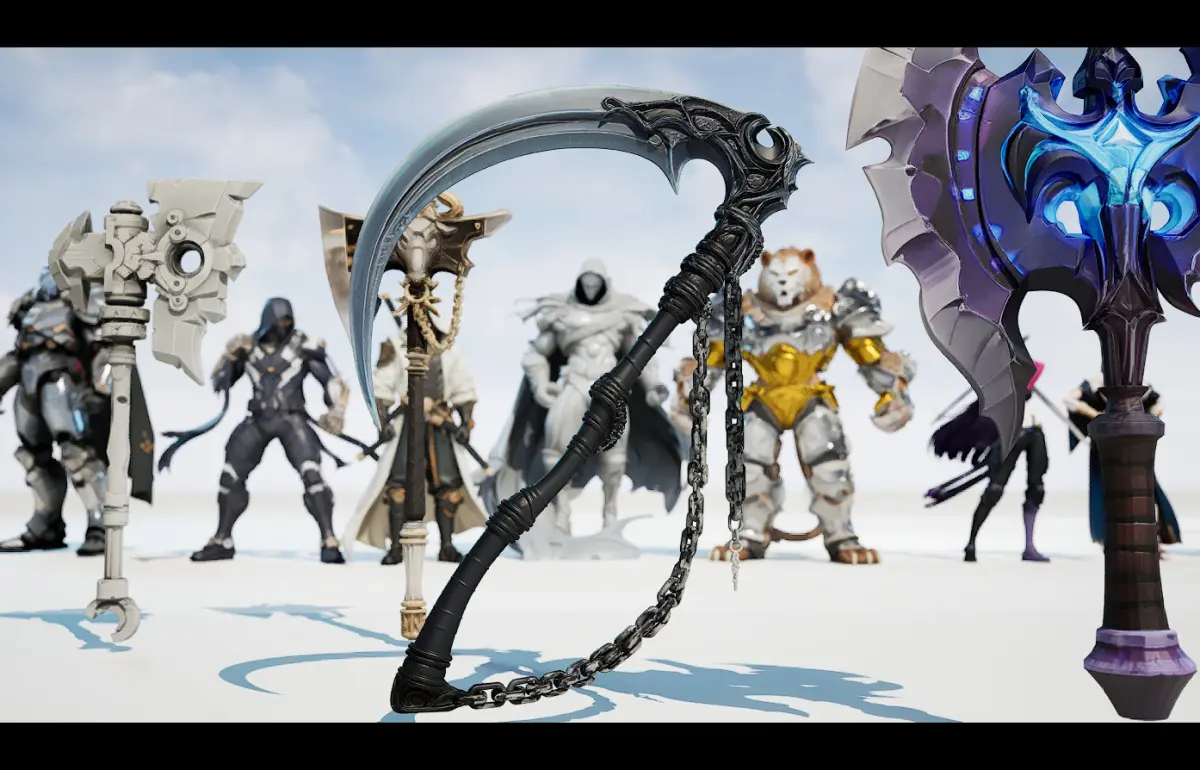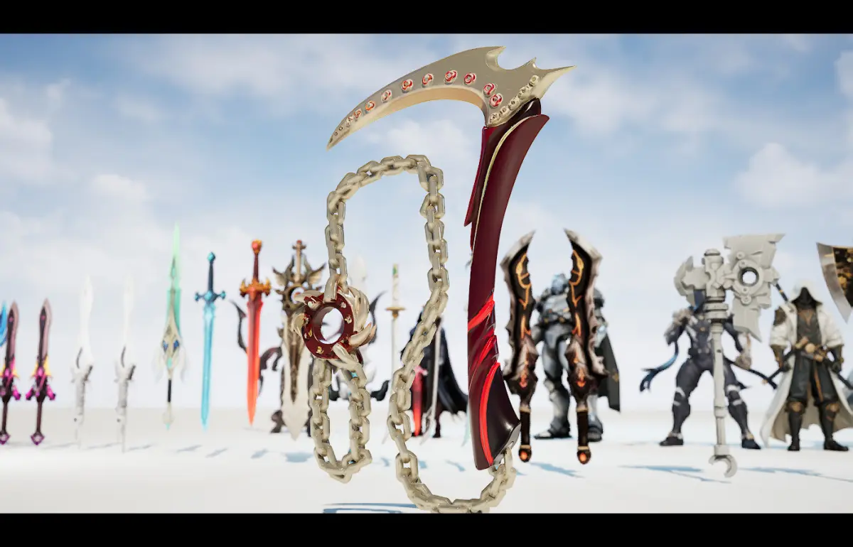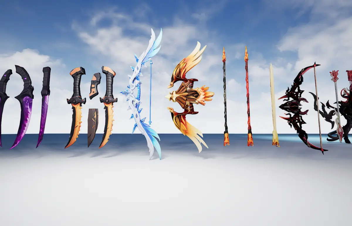 26+ models of weapons including Fantacy Swords , Sctyhes , Bows , Knives , Shurikens , Axes