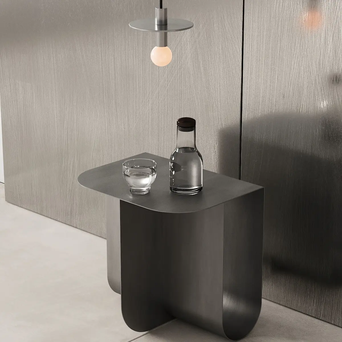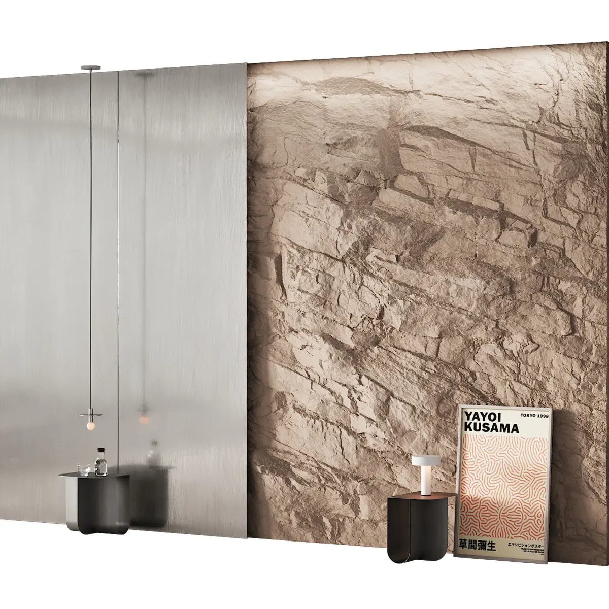 The model also has decor and filling: a bottle of water, a glass, a table lamp, a pendant lamp, a bedside / coffee table, a poster / picture, the exact names of which are indicated in the names of the object.