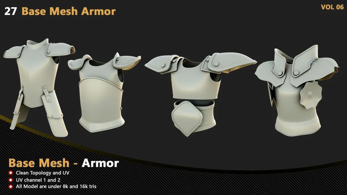 In each project, many items required by the artists consist of repetitive and similar items. To increase the speed of each artist in all tasks and parts of the project, In this package, we gather around twenty seven different types of armor for you. All of them have proper UVs.