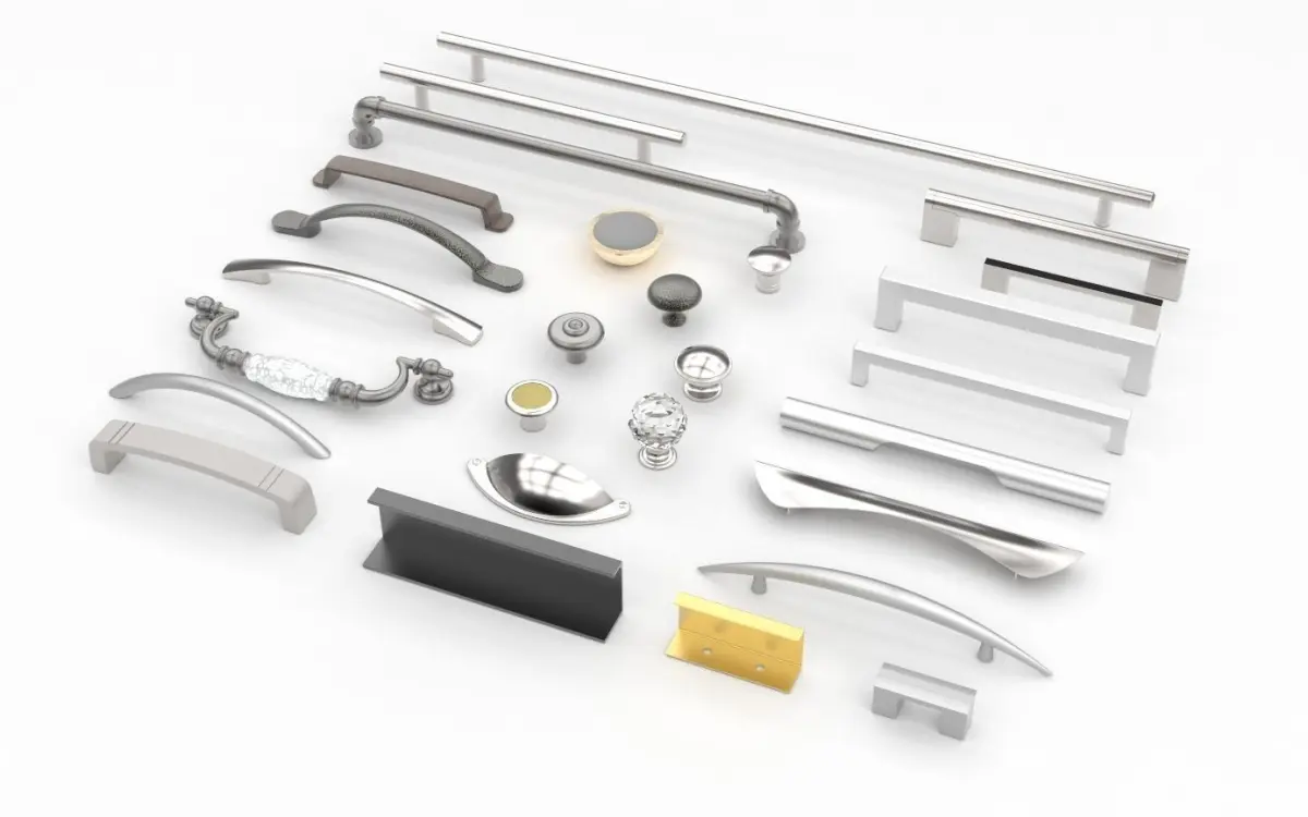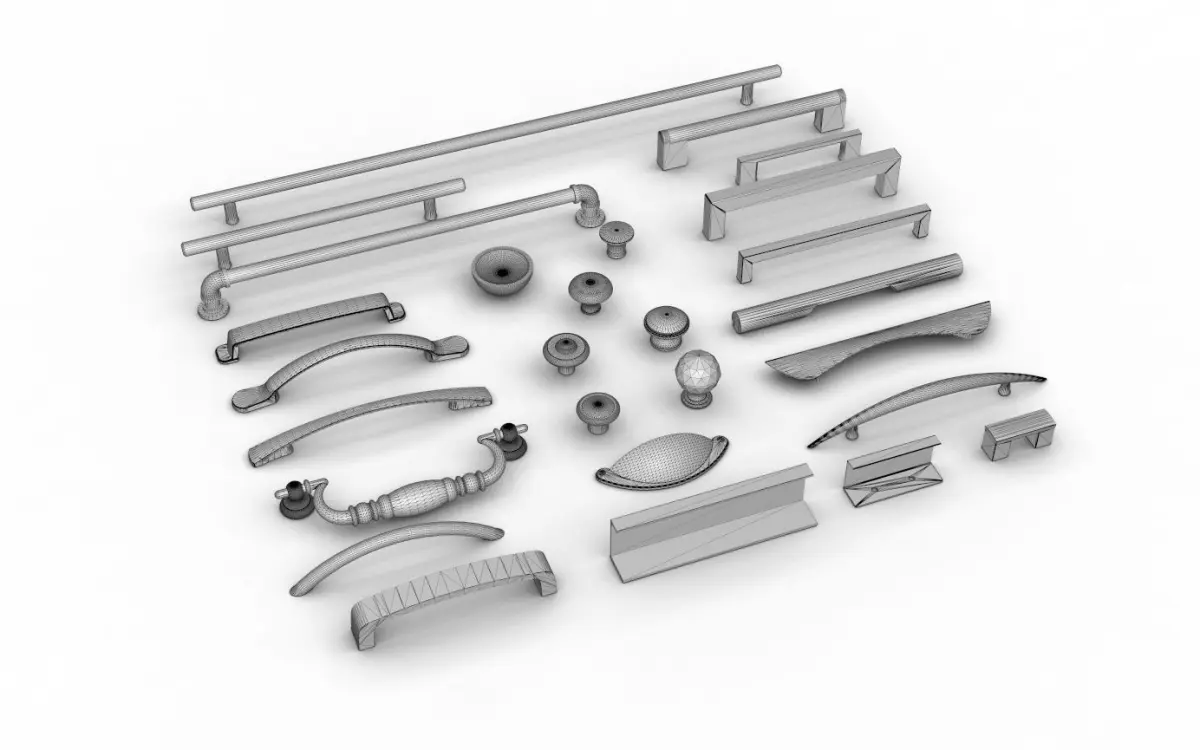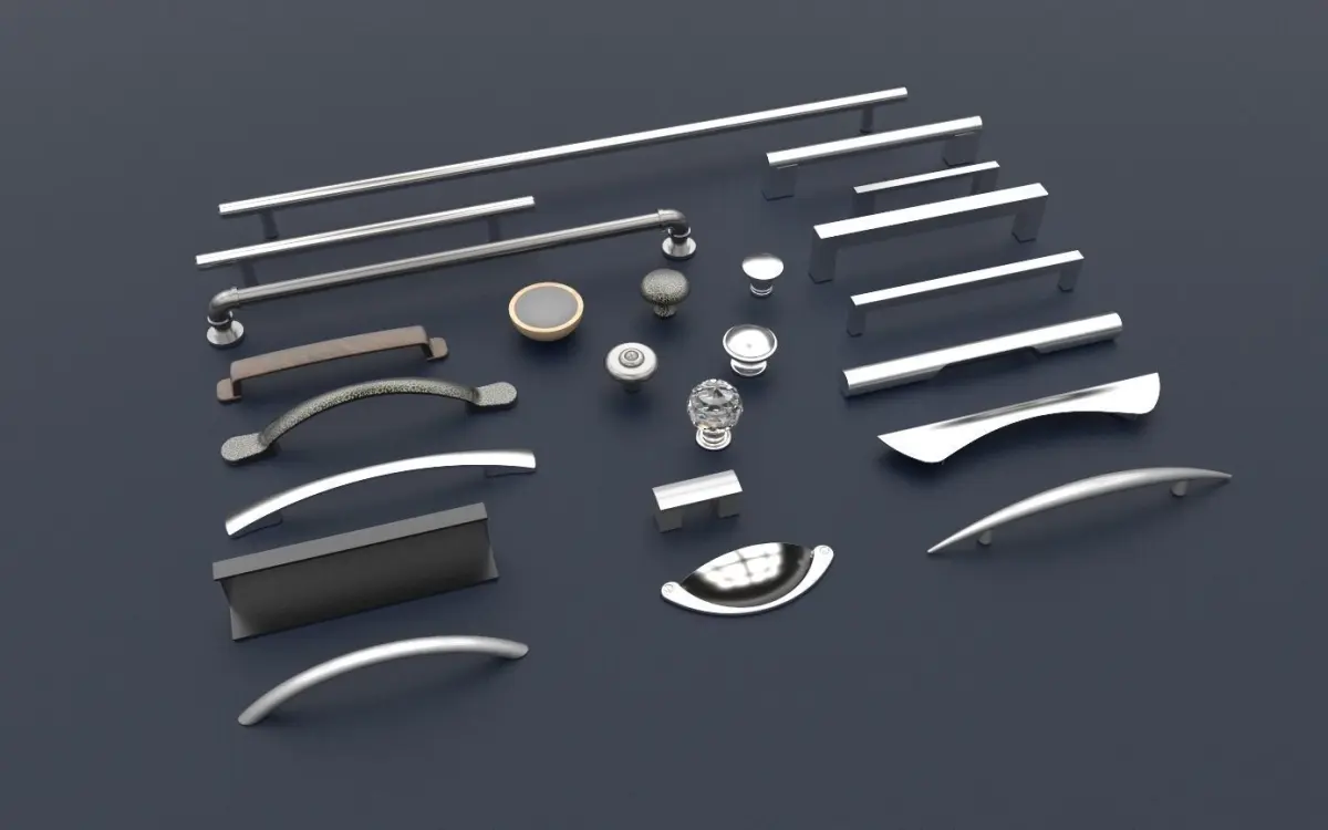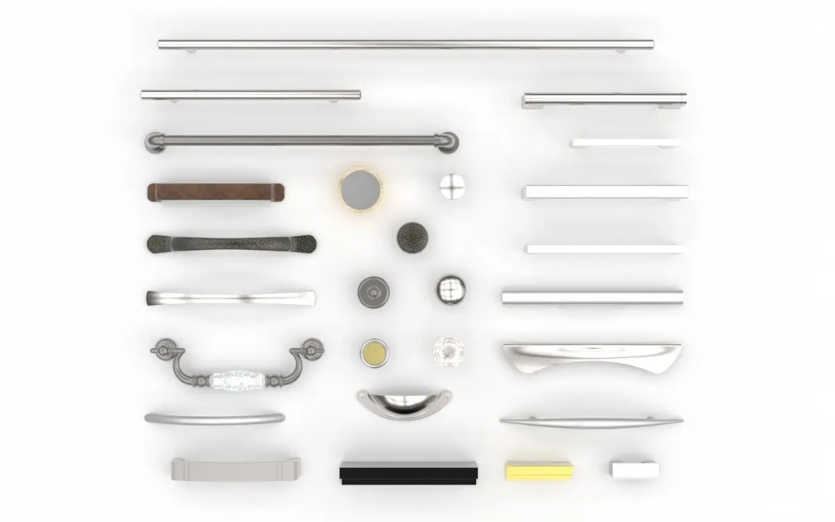 This is a pack of cabinet furniture handles and knobs, suitable for both kitchen and bedroom usage. Includes 27 different door and drawer handles ranging from old fashioned and traditional to modern and contemporary styles. Materials include brushed aluminium, steel, crystal, plastic, and oak.