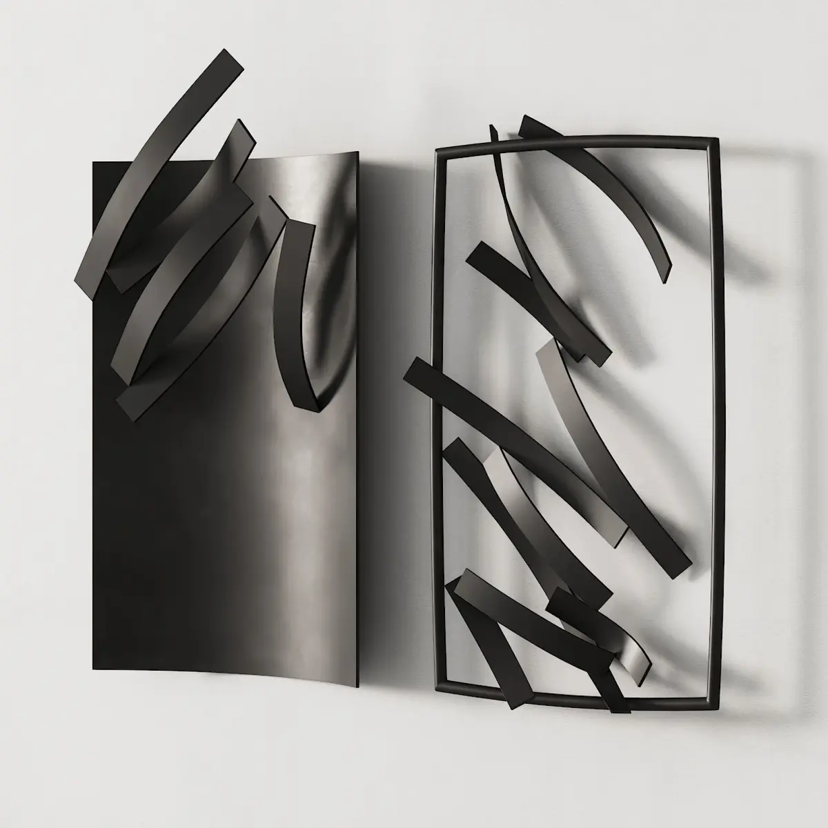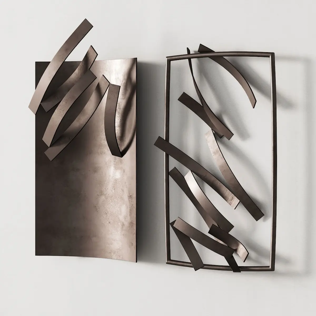 3d model: wall art object / wall sculpture / artwork / wall art by Roberto Alamagno. The scene features two art objects in four different materials. Suitable for modern/minimalist/scandinavian/japandi/wabi sabi interiors.