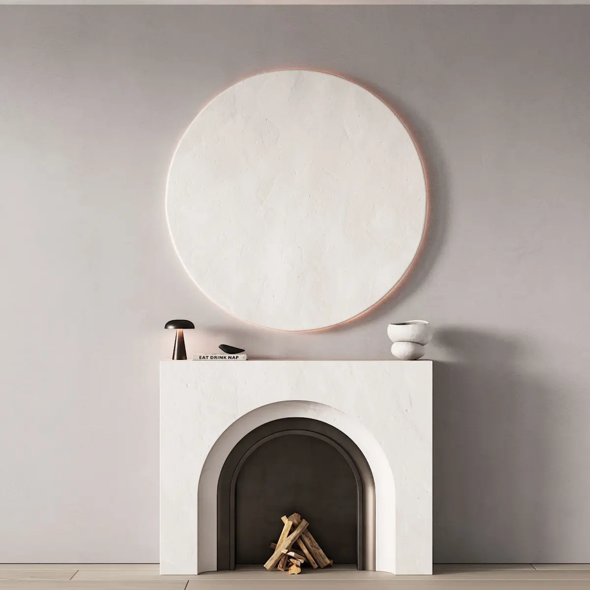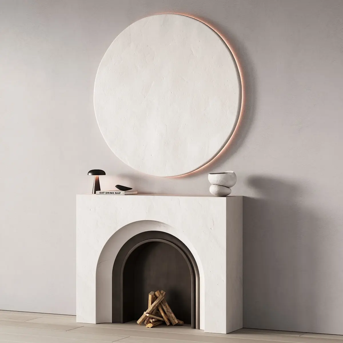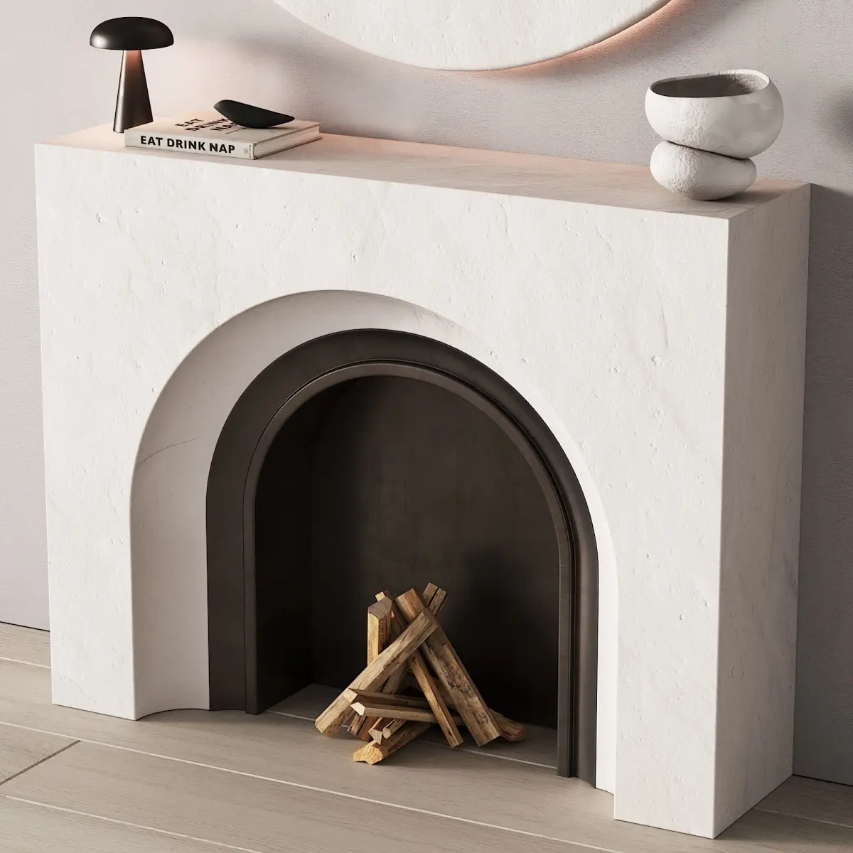 3d model: fireplace area / fireplace in the form of an arch, wall panel / round wall panel with LED backlight, decor (bird figurine, table lamp, book and vase), firewood in the furnace.
