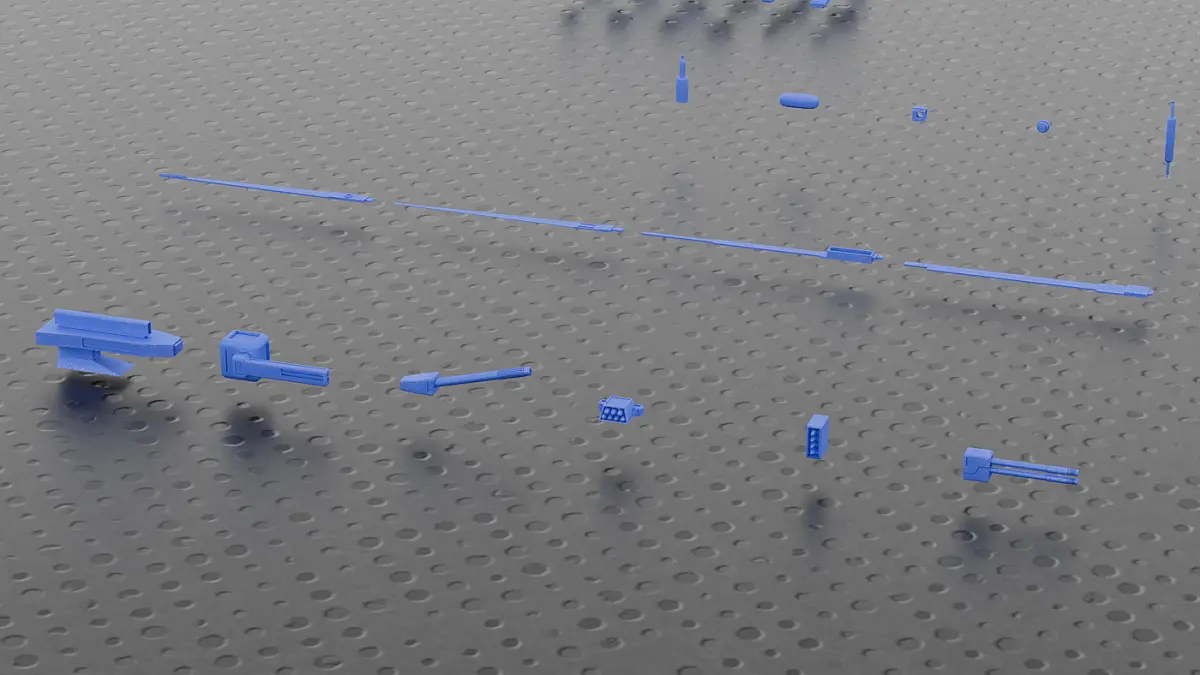 Includes legs, arms, wheels, lights, wings, hulls, cockpits, medium bodies, weapons, rotors, driveshafts, brake discs, interior spaceship parts such as chairs, computers, drive sticks and control boxes, mech feet and mech hands, and engines, and tank tracks. Not triangulated.