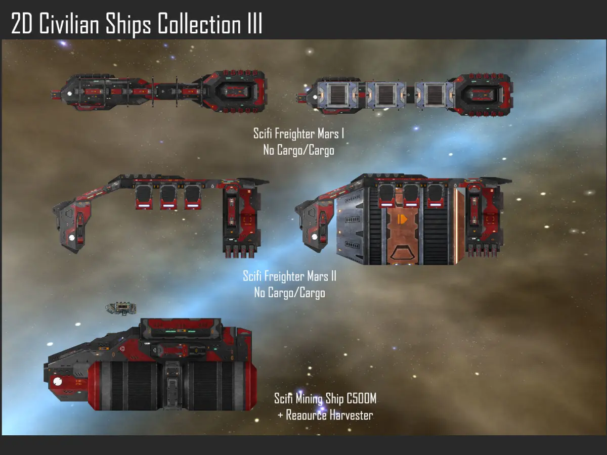 This pack contains 2D spaceships. They can be used in a space game. The ships are combined on a texture atlas, weapons and missiles/torpedoes are on separate textures. Each ship is also available on a separate layer in the PSD sourcefiles.