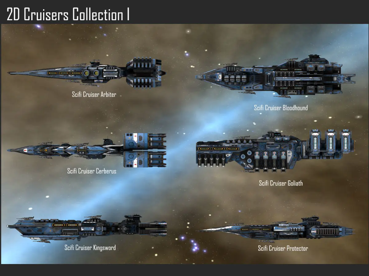 This pack contains 2D spaceships. They can be used in a space game. The ships are combined on a texture atlas, weapons and missiles/torpedoes are on separate textures. Each ship is also available on a separate layer in the PSD sourcefiles.
