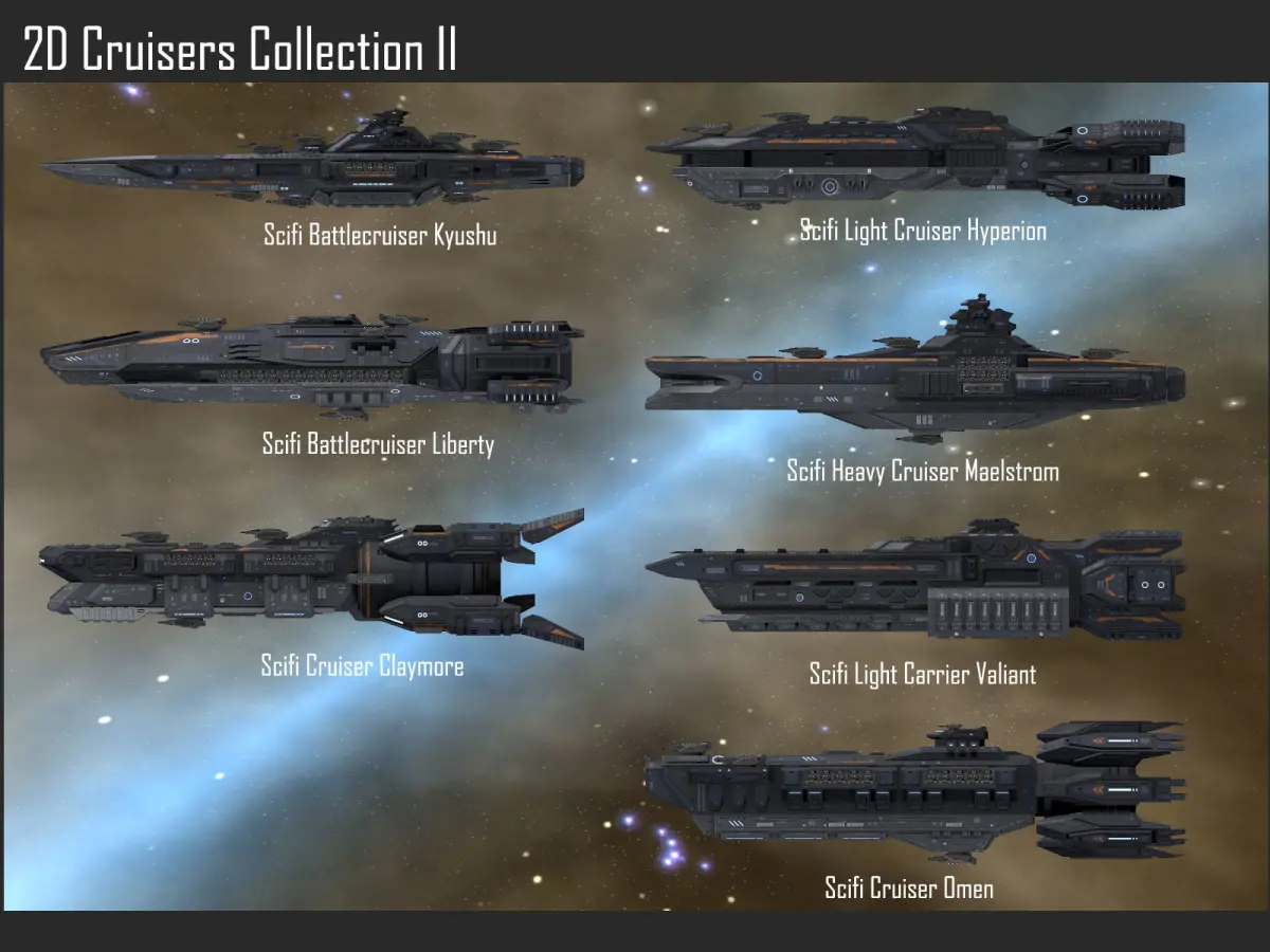 This pack contains 2D spaceships. They can be used in a space game. The ships are combined on a texture atlas, weapons and missiles/torpedoes are on separate textures. Each ship is also available on a separate layer in the PSD sourcefiles.