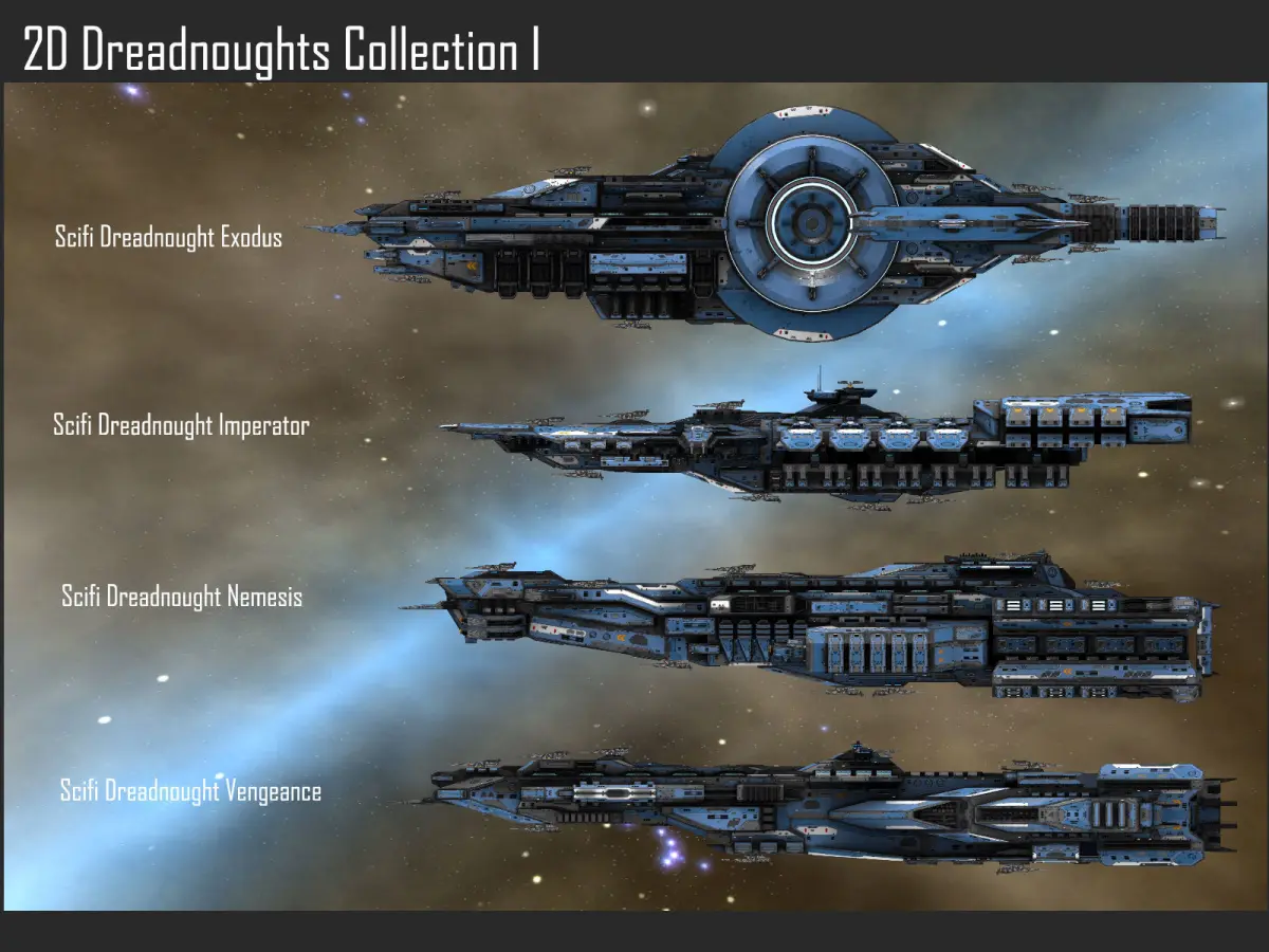 This pack contains 2D spaceships. They can be used in a space game. The ships are combined on a texture atlas, weapons and missiles/torpedoes are on separate textures. Each ship is also available on a separate layer in the PSD sourcefiles.