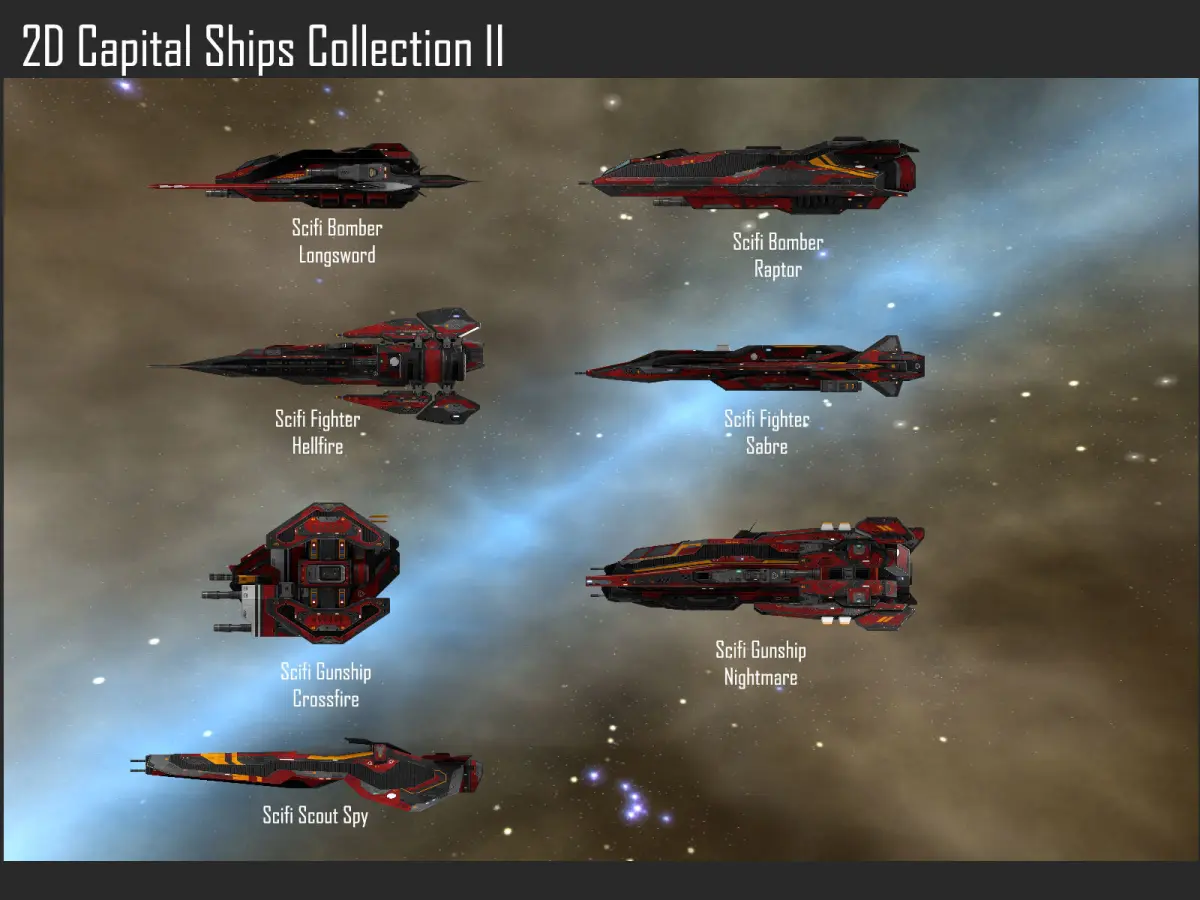 This pack contains 2D spaceships. They can be used in a space game. The ships are combined on a texture atlas, weapons and missiles/torpedoes are on separate textures. Each ship is also available on a separate layer in the PSD sourcefiles.