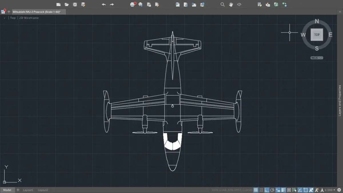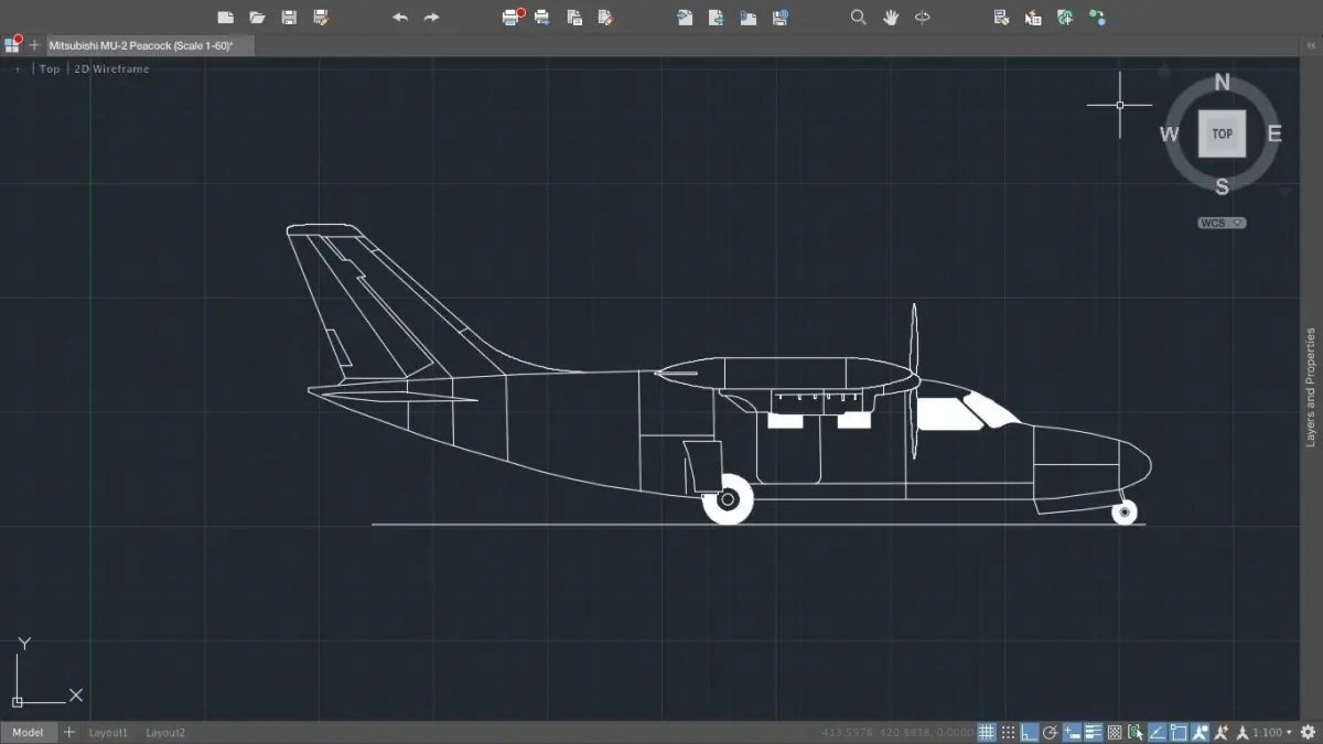 The 2D Mitsubishi MU-2 Peacock aircraft is in orthographic view and it has a scale of 1:60.