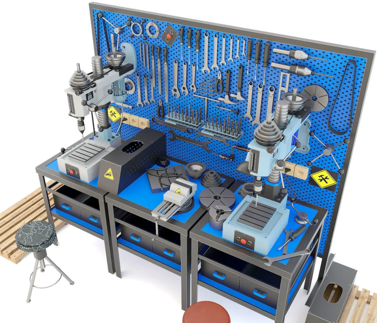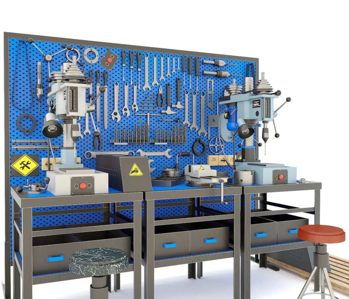 We offer you a realistic, detailed and unique industrial collection consisting of 48 (forty eight) tools, spare parts, components, as well as other items at once. The presented collection includes both a 2M112 desktop drilling machine in two colors, but also all kinds of production tools necessary for its operation in reality, such as wrenches, cap and horn wrenches of various types and sizes. Drills, files, sockets, tools for servicing and working on the machine, a workbench, an industrial chair and a lamp located on the machine, large production vises, pliers, a file, a variety of wrenches of various types, hammers, drills, hand drills, spare parts, accessories and other tools. A wooden ladder for the most convenient and correct operation on the presented industrial equipment, and of course, a special shield with a modern blue insert on which, for greater convenience, the entire tool is located for the implementation of the necessary work, and along with this other operations. The collection has a high degree of elaboration, this applies to both the drilling machine and all small elements, including the study of materials, as well as textures, which will definitely add even more realistic presentation to the entire composition. The collection is recommended for both full-fledged production scenes, but it is also perfectly suitable for a 3d workshop and garage, as well as other production options.