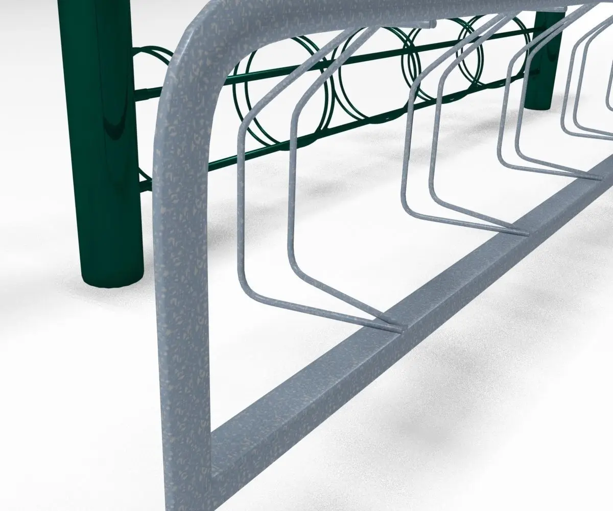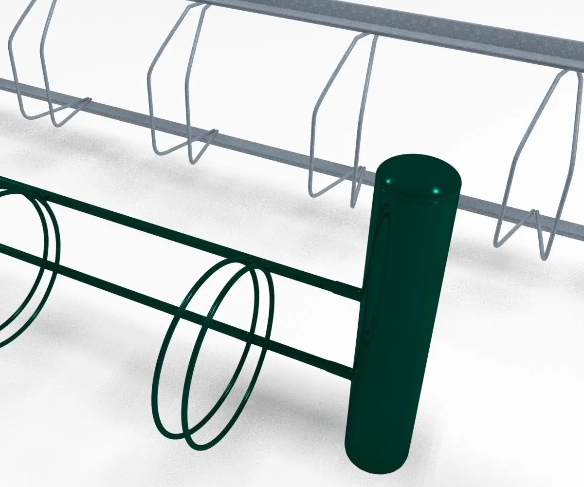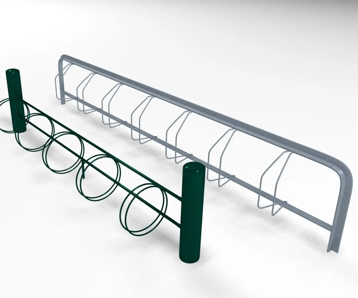 One pair of bicycle racks.Two models named Rack01 and Rack02.Rack01 of steel, with wide holders. Rack02 of green painted metal and is a bit more detailed.