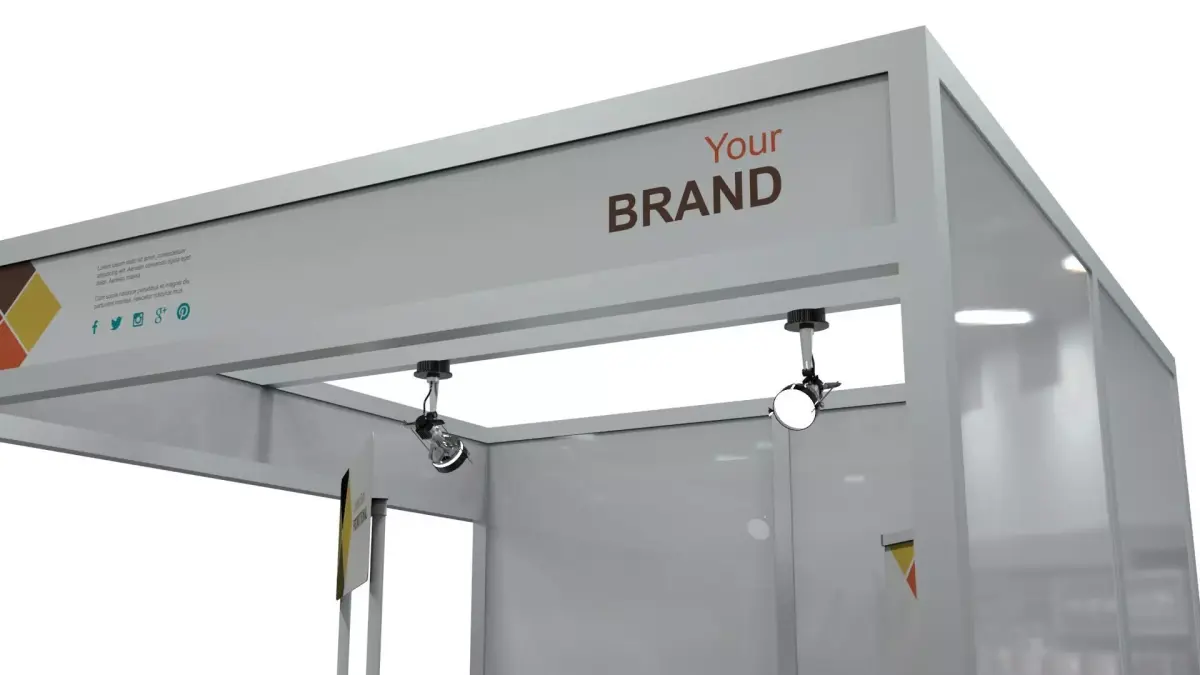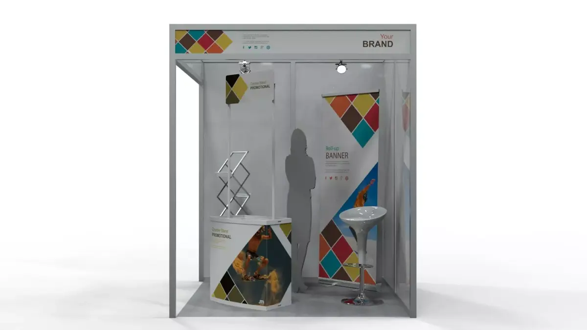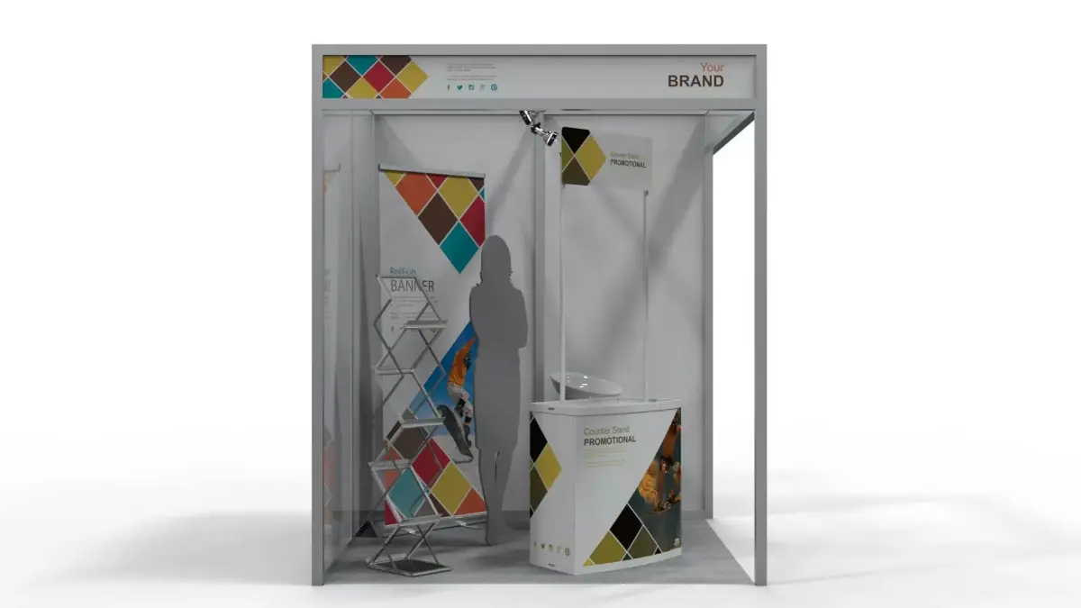 This 3D model represents a compact and functional 2x2 meter trade show booth, ideal for retail activations, corporate exhibitions, and brand presentations in limited space environments. The layout combines essential promotional furniture and signage components in a clean, professional configuration.