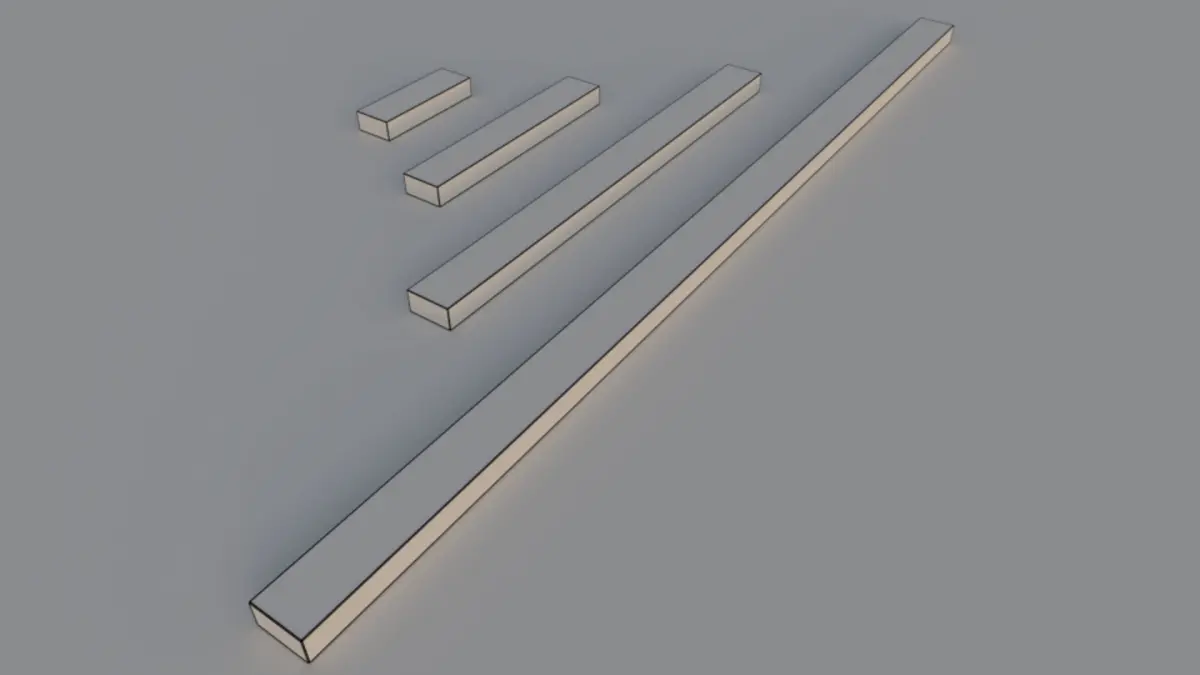 Pack of wooden 2x4 planks, to scale, sizes are 1', 2', 4', and 8' long.