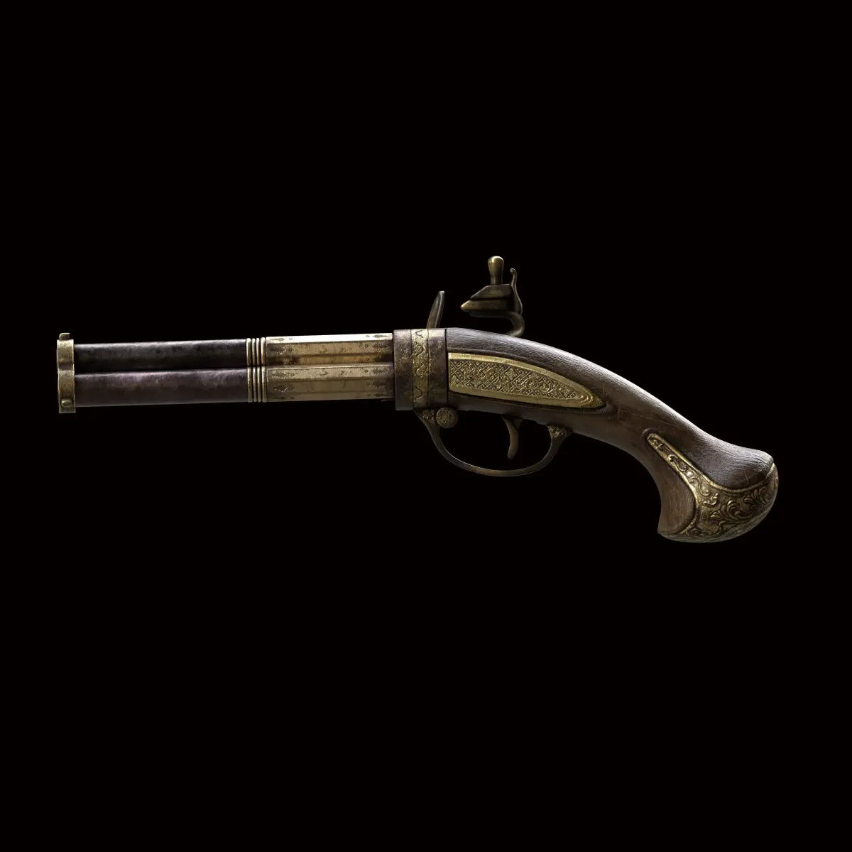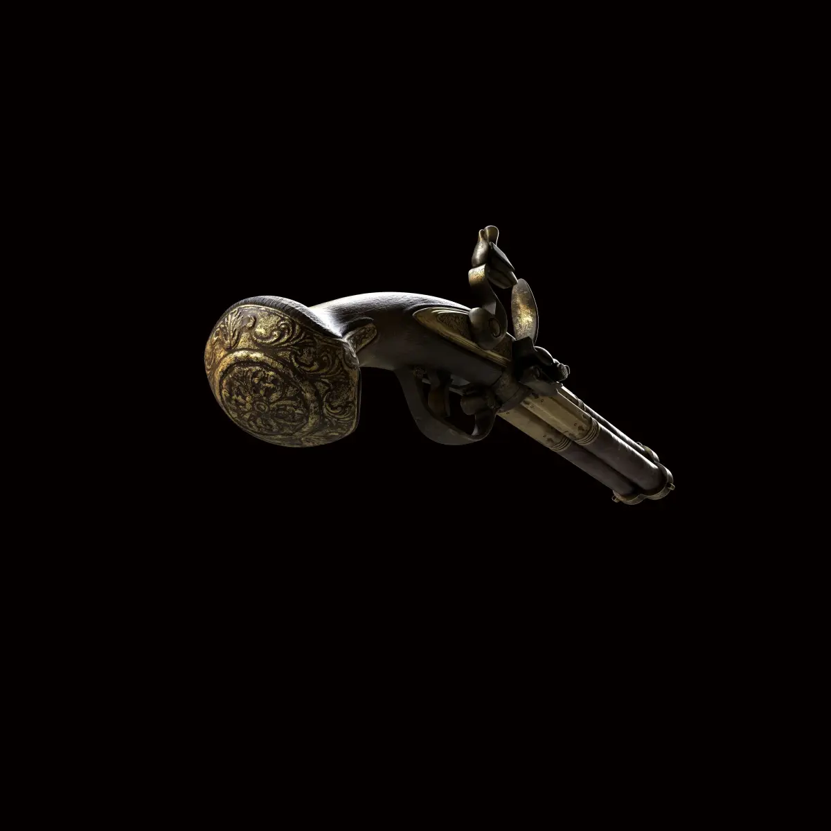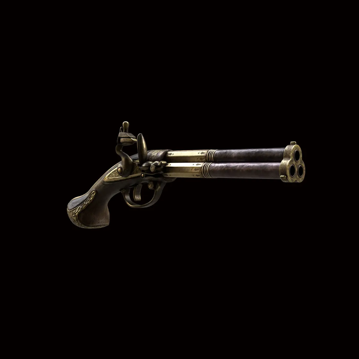This 3 Barrel flintlock pistol features a brass finish and dark wood grip.