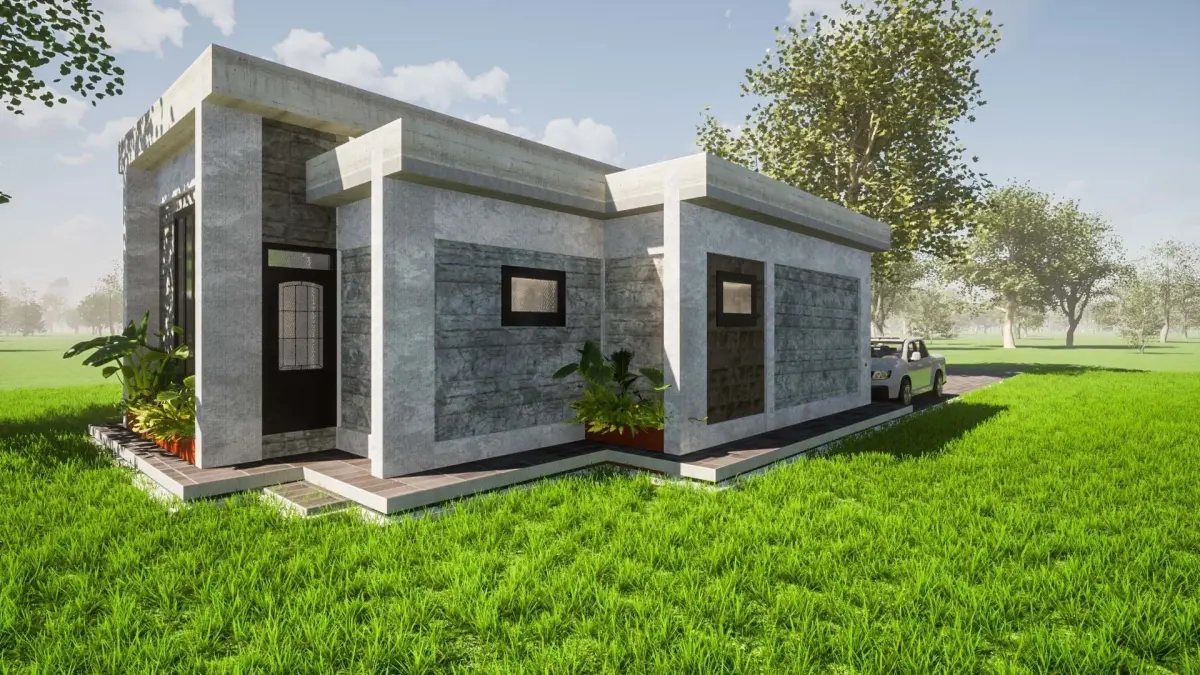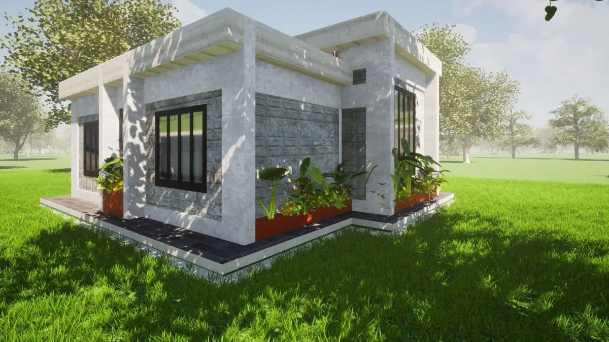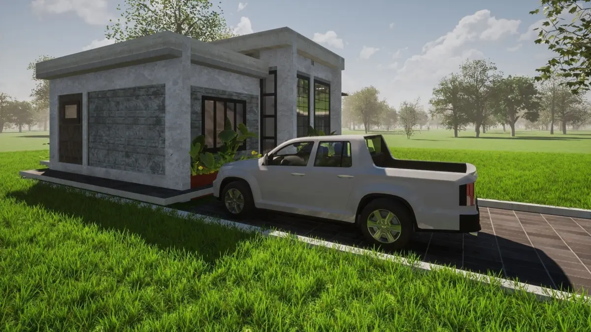 This is a model for a flat-roofed three bedroomed house with interior partitions and plain furniture made in Archicad and rendered in Twinmotion. The model comes as shown in the screenshots. Material and vegetation will differ from renders as the model was rendered in Twinmotion using Twinmotion materials and vegetation.