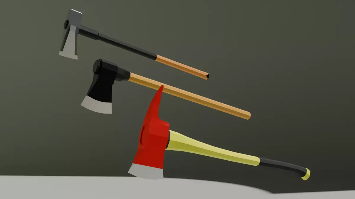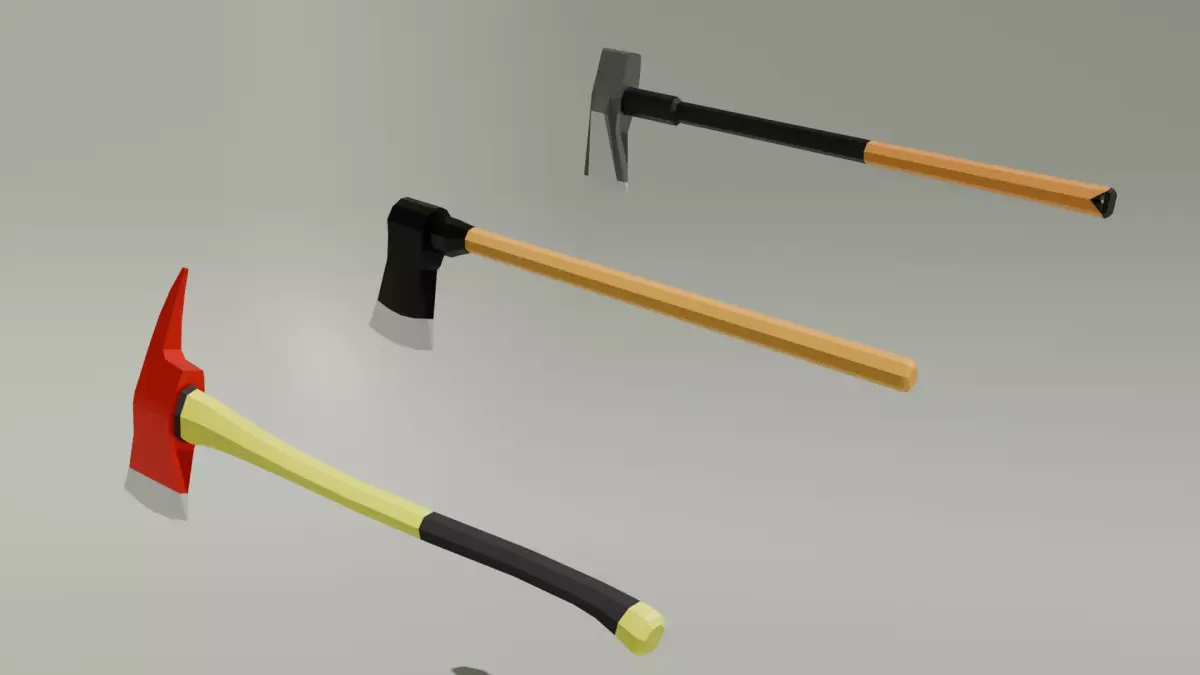 hacha de bombero poligonos 275 triangulos 560 . segunda hacha poligonos 190 triangulos 380 . tercer hacha poligonos 246 triangulos 488cada una esta en una carpeta en formato FBX,OBJ,GLB y BLEND. la carpeta esta comprimida en formato RAR