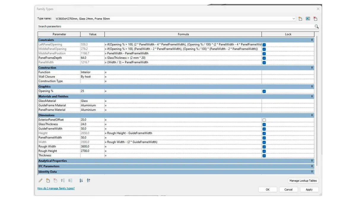 First and middle panels slide open ( one direction - but model can be flipped ) with parameter to control the graphical represantation. User can create family types controling the rough width and height, glass thickness, panel offset from wall, guide frame and panel frame width as well as the materials.Panels net width and height are calculated automatically from rough width and height and the frame width parameters.Panels frame depth also is calculated automatically from the glass thickness parameter.Bottom guide frame is embedded into the floor.