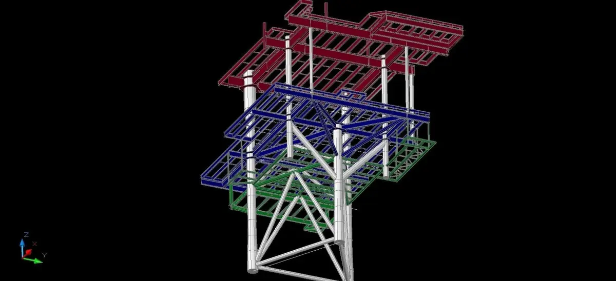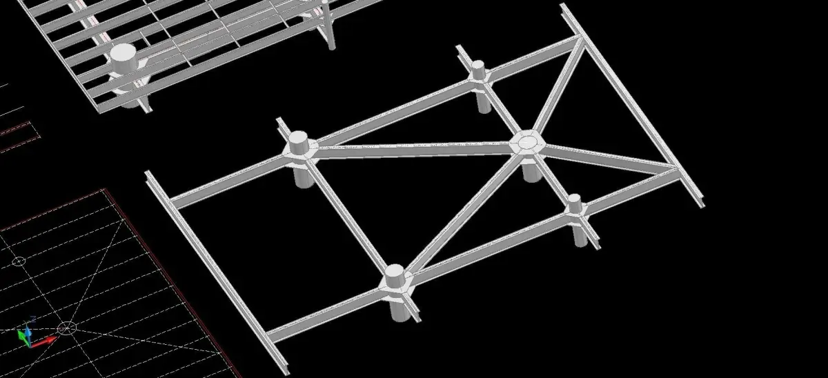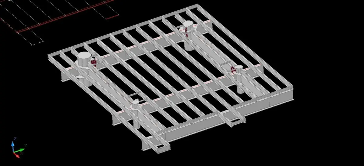 3 part deck phase I, main deck framing, with ring plates and lifting eyes for one point rigging and the final, crane pedestal at 42" leg, not really a rendering just an autocad visual shade