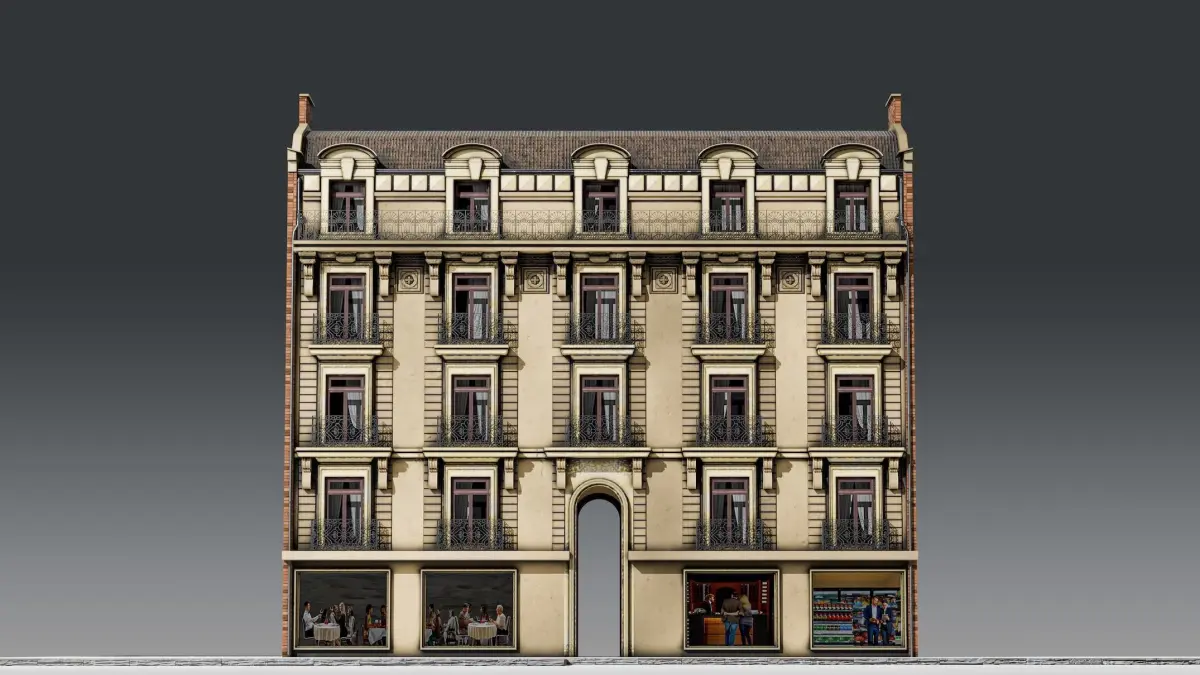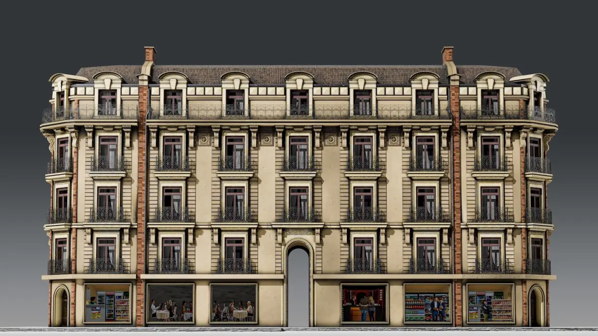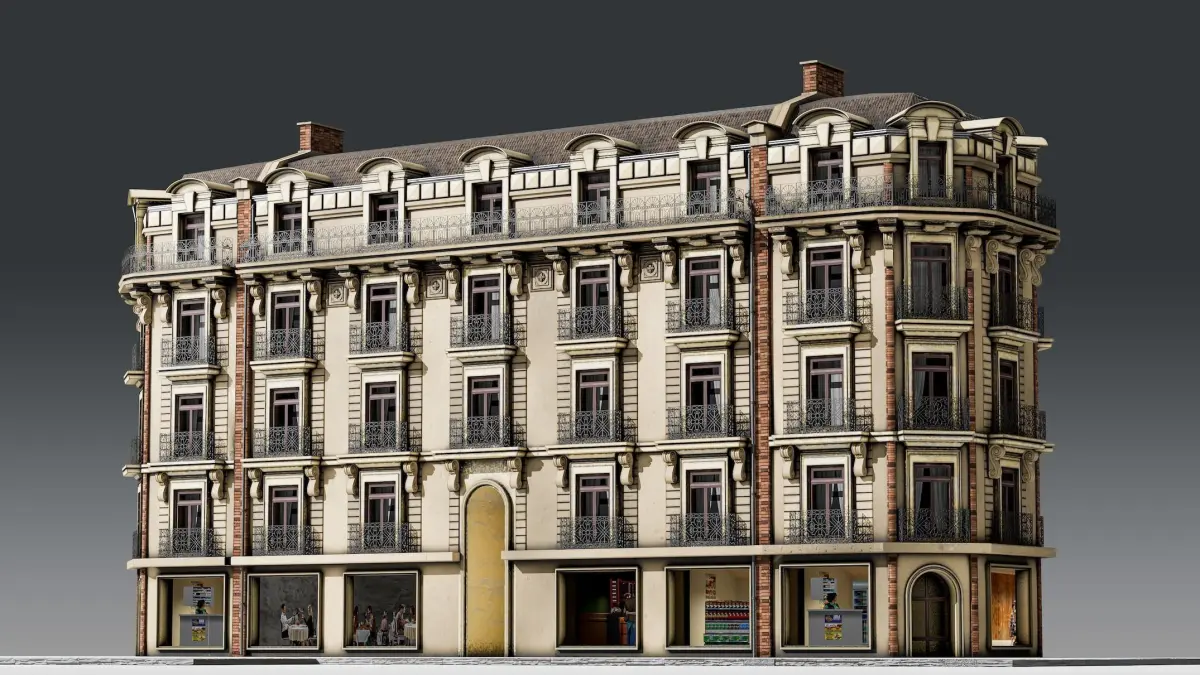 Window and surface materials are configured for random variation for instances ensuring each instance has unique surface details. First floor window textures are parallax, meaning they offer 3D room interior effect responding to camera position.