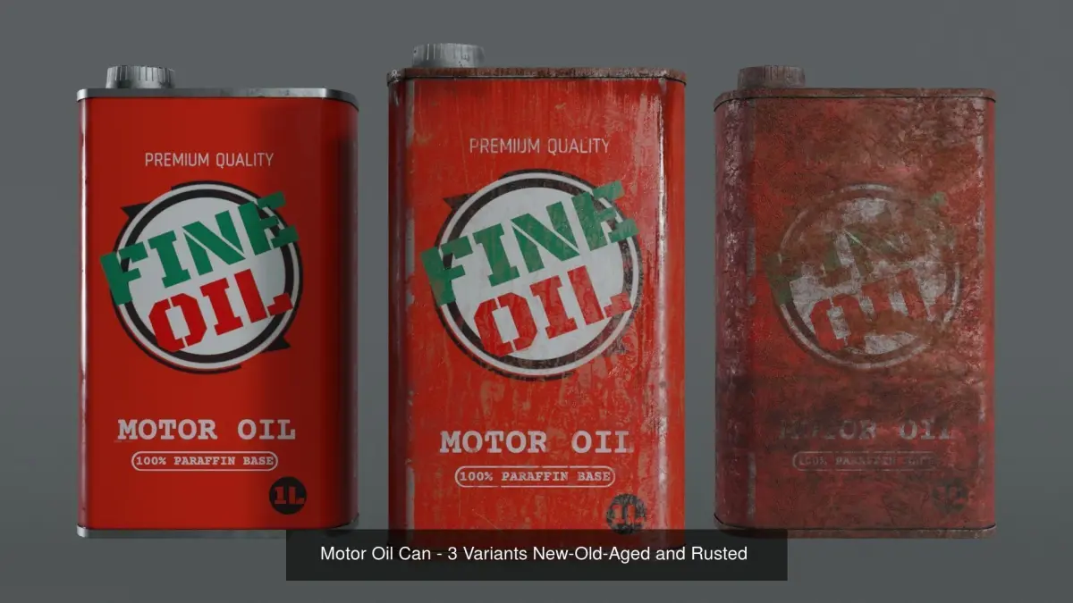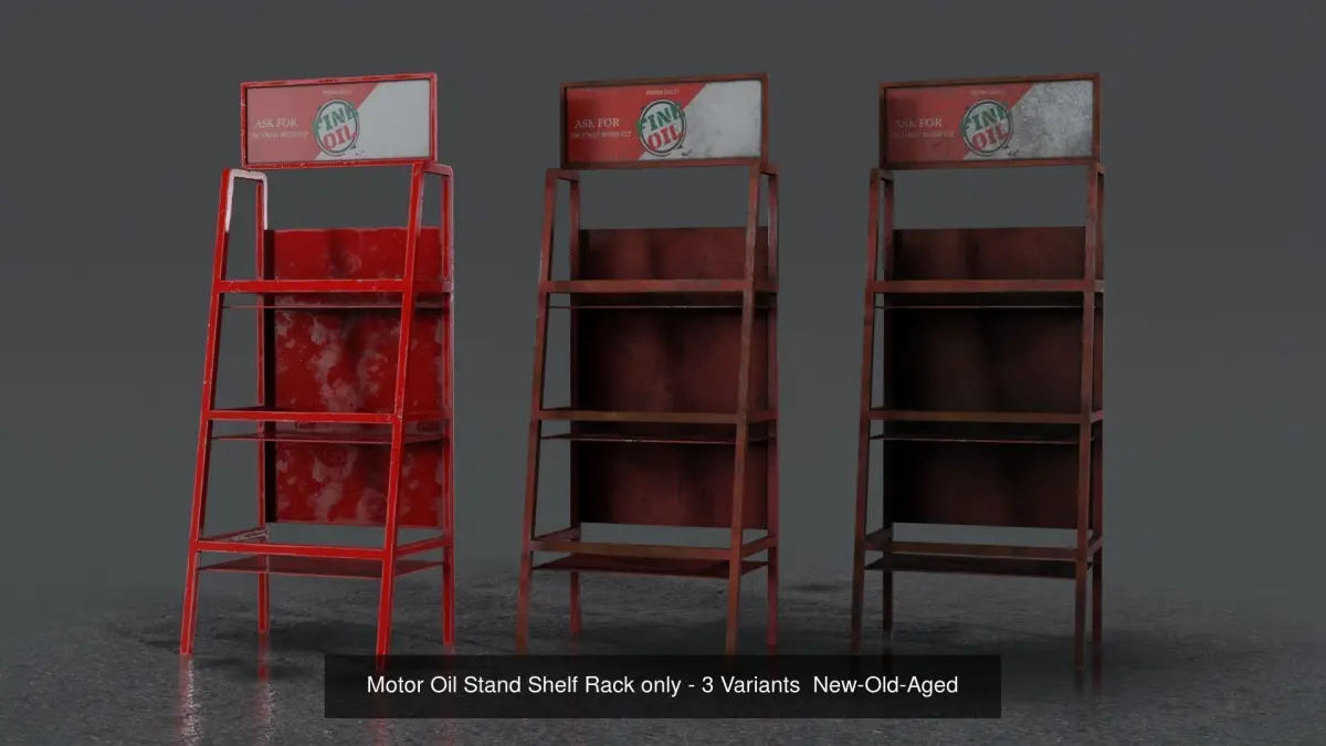 This collection offers two separate props that can be utilized together or individually: The Motor Oil can and the Display Racks. Both items are available for purchase separately, albeit at a slightly higher price, making the entire collection actually provide a more cost-effective solution. Each prop is presented with three distinct Texture Variants: New, Old, and Rusted, and comes complete with a detailed 4096x4096 PBR Texture set.