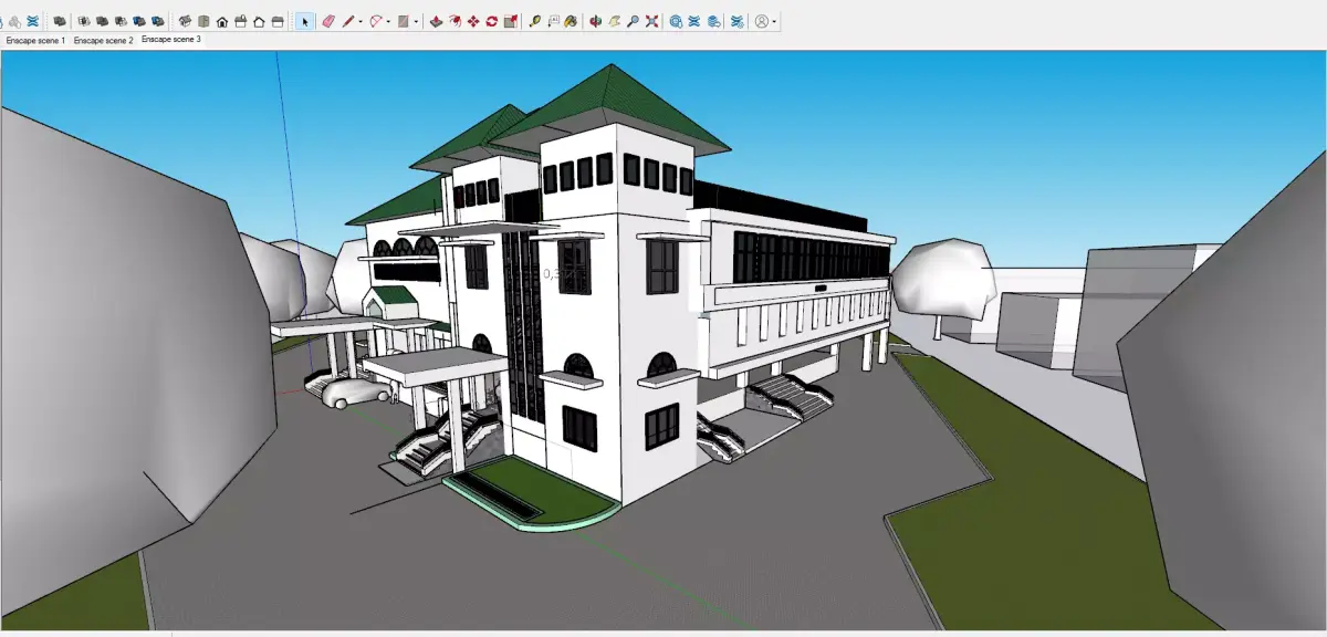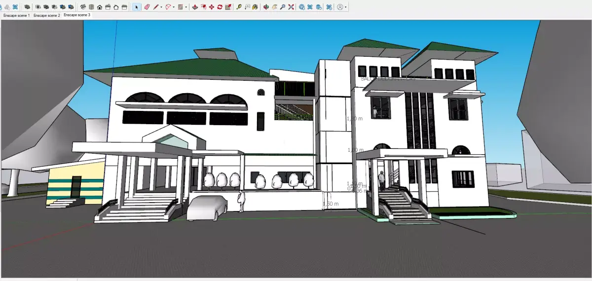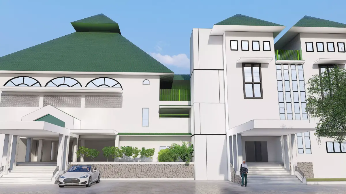 Modern 3-storey mosque design with spacious prayer halls and supporting facilities. Ideal for architectural visualization, urban planning, and religious building projects.