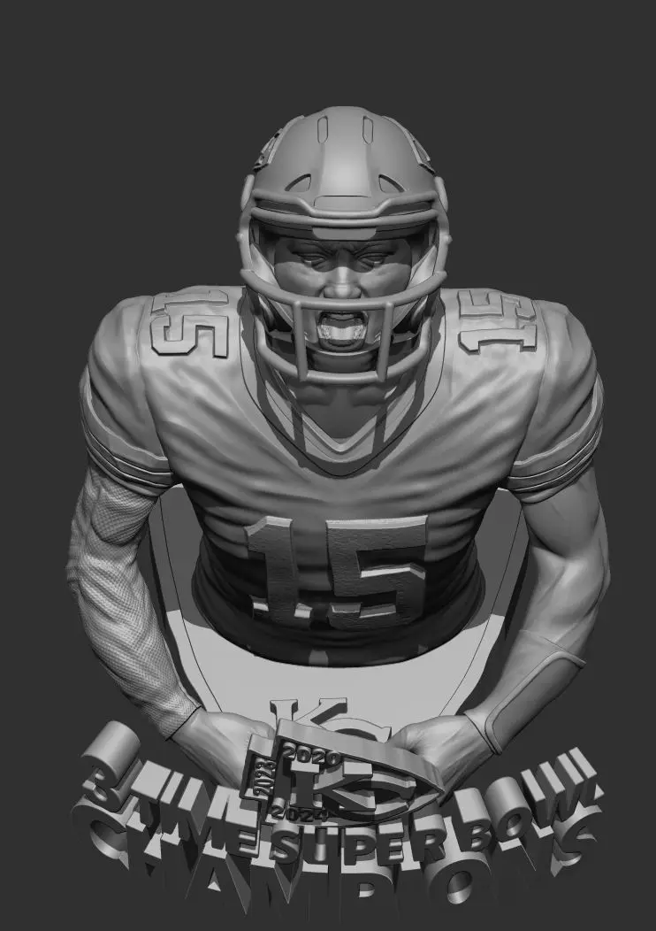 The Chiefs defeated the 49ers in Super Bowl LVIII in Las Vegas to become the seventh team in league history to win four Super Bowls. This is truly a FAN ART piece as I have followed Mahomes career since he played in collegue football at Texas Tech. Some details about the model: the words 3 Time super bowl champions is at 65 mm (2.6) in height. You can print it seperately to any height you would like and its free-standing. The base and the rest of the model total 171 mm in height (6.7). Please enjoy this piece and hopefully in 2025 we will have another model show casing the 3-peat!!!