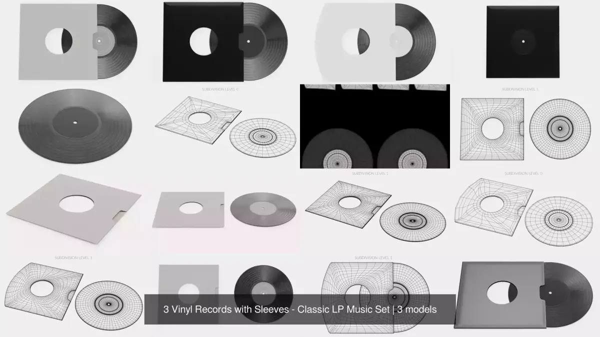 A versatile set of three realistic vinyl records, each paired with its own protective outer sleeve. This collection is fully modular: the discs and sleeves are separate objects, allowing to pose them fully inserted, partially out, or as standalone elements. Each record features detailed spiral grooves and authentic light reflections, while the sleeves come in three neutral colors (black, white, and grey) with realistic paper textures. These non-branded assets are perfect for adding a credible, high-end musical touch to any interior render or commercial project.