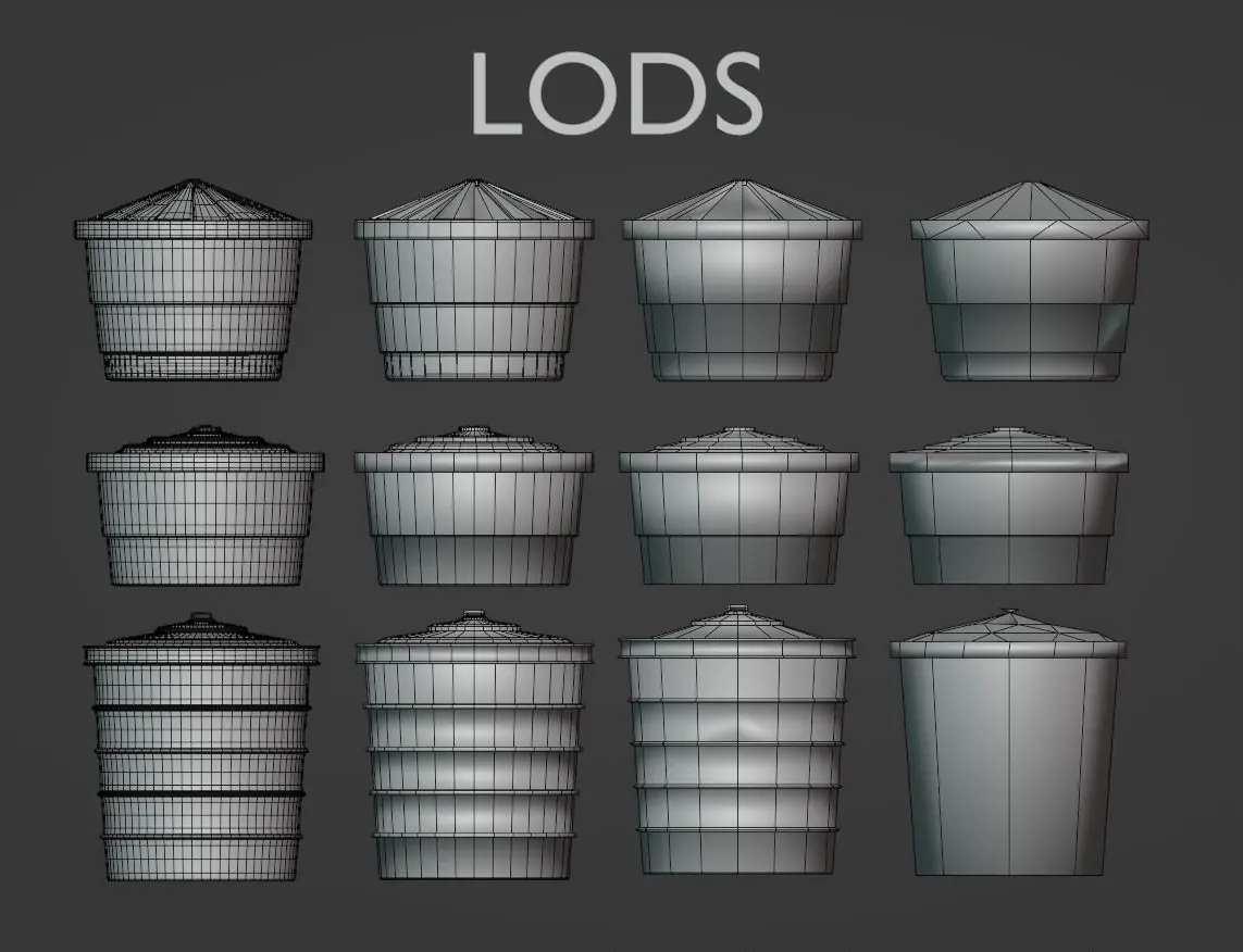 Water tank models for games.The material is procedural and editable.The package has models with low polygons to render at a distance (LOD).The HIGH and LOW models are fully modeled while the LOD models are only modeled from the outside.You can modify the lids with the tanks and change their materials in the .blend file.Any I am available.Thanks.