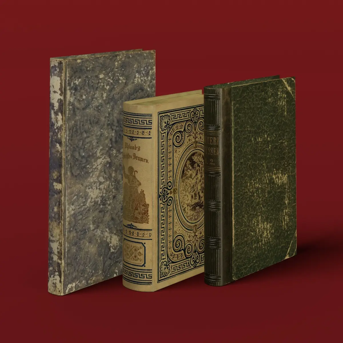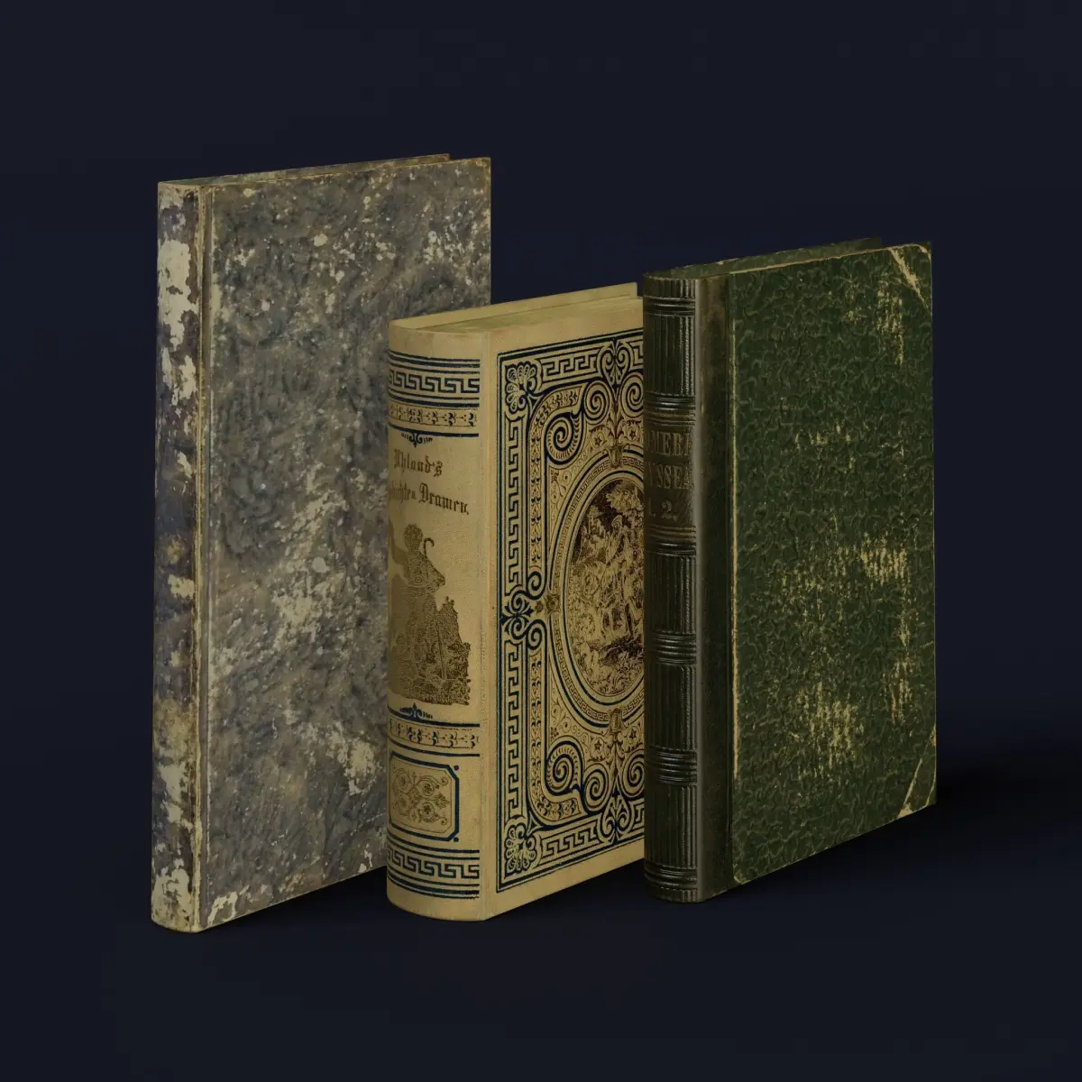 3 worn ancient books for universal use.