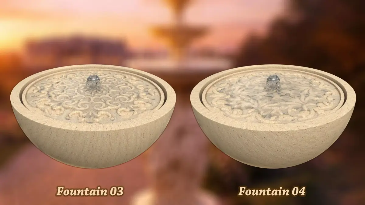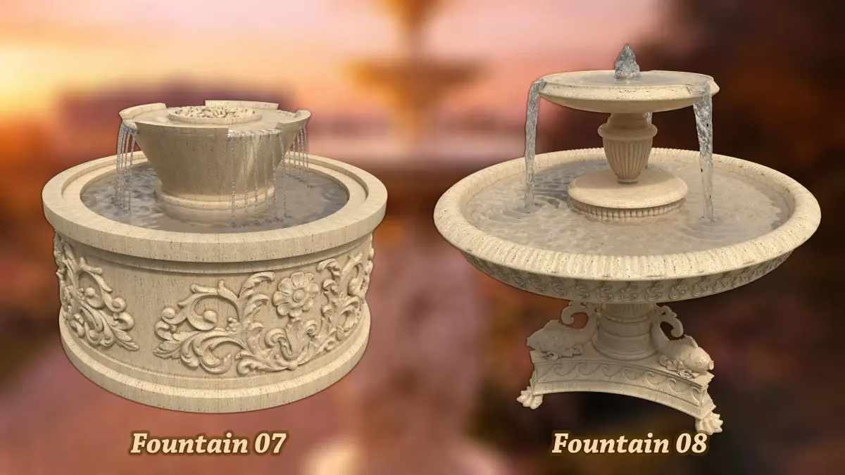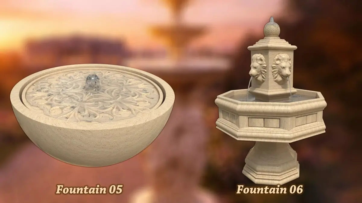 - A carefully crafted set of 30 classical fountains, inspired by European gardens, palaces, and historic courtyards. Each fountain features realistic water simulation for visual richness—static and non-animated, making them lightweight, predictable, and perfect for both real-time and offline workflows.
