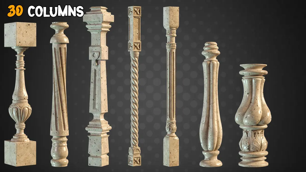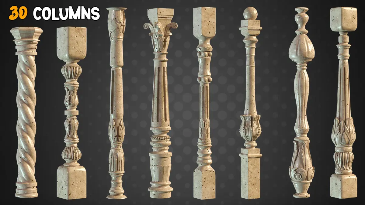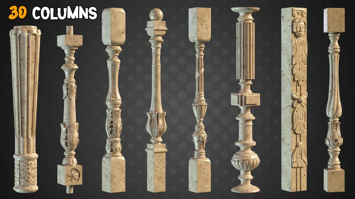 30 Ornamental Columns 3D models25 Ornaments Brush16 BitZbrush Brush , PSD , PNG , TIF, OBJ , FBX , MAX ,PDF (preview)Unwrapped3D Models OBJ-FBX-Max File.Full HD Tutorials(1080)Note :