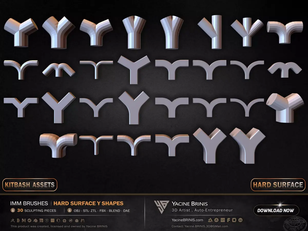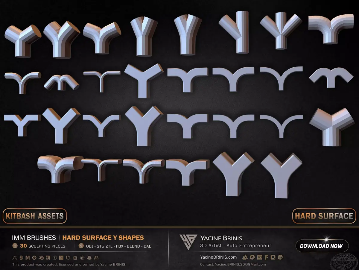 I am presenting a structured collection of 30 hard surface IMM Y-shaped elements, built for branching systems, modular construction, and advanced hard surface workflows.