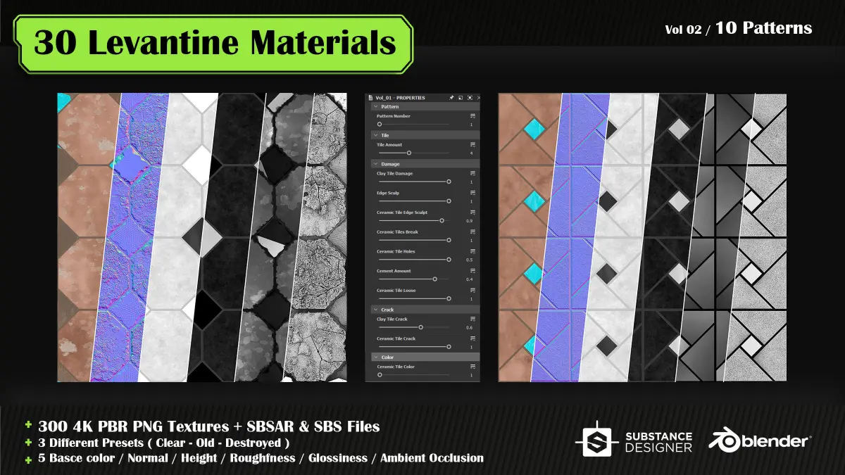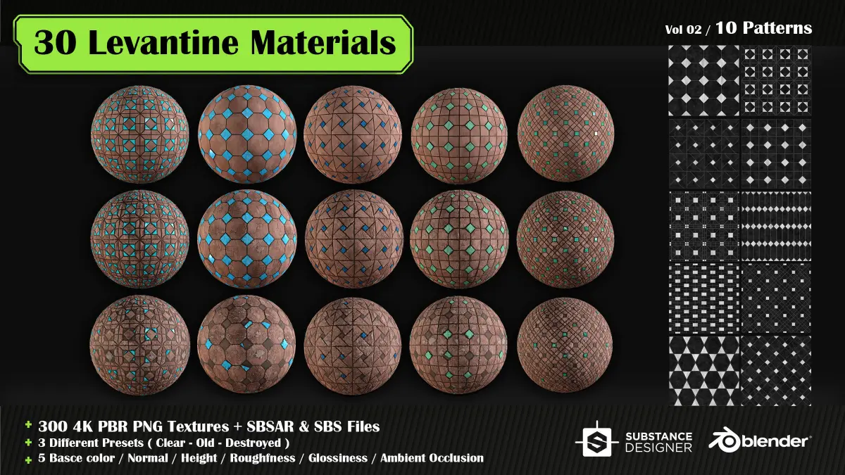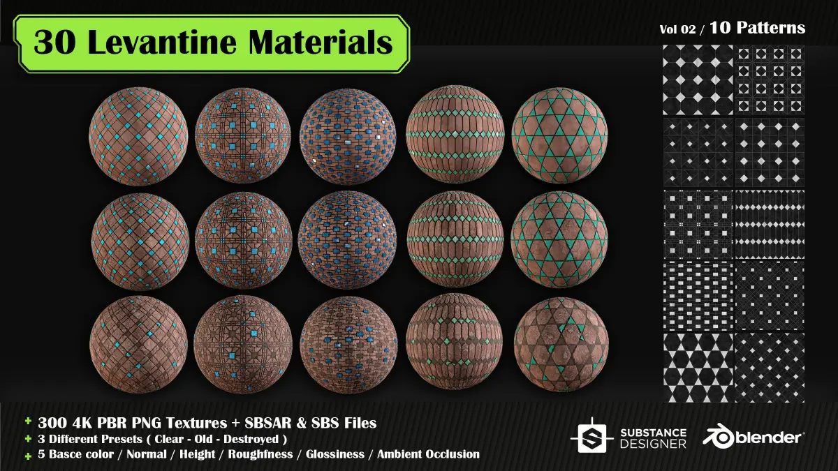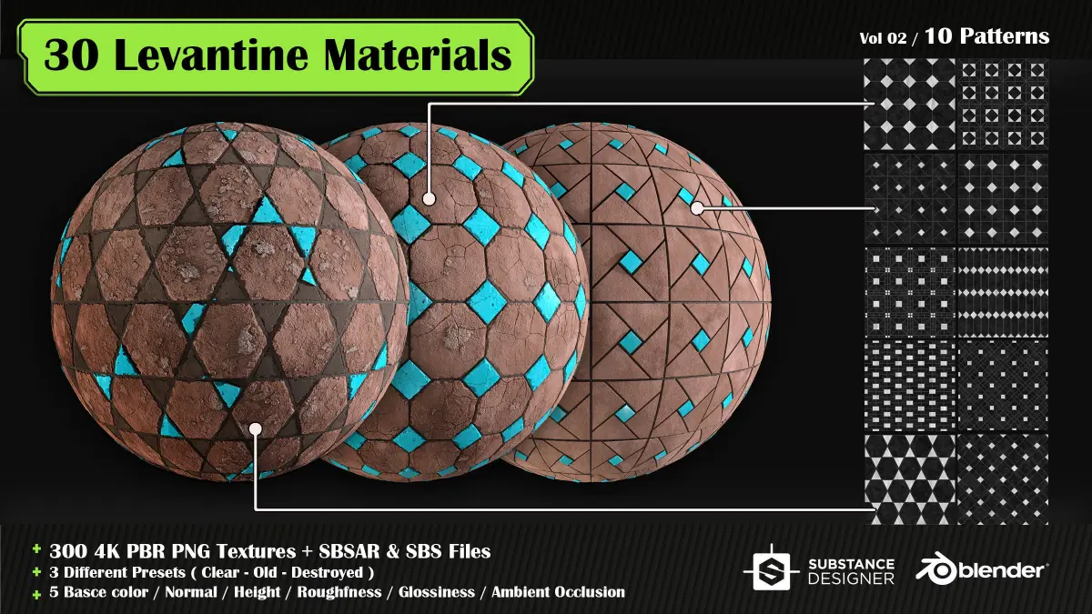 This Product includes the SBSAR file and 300 4K PBR textures. You can use the PBR Textures for any program that works with PBR workflow! Also, 10 Levantine Patterns in png format.