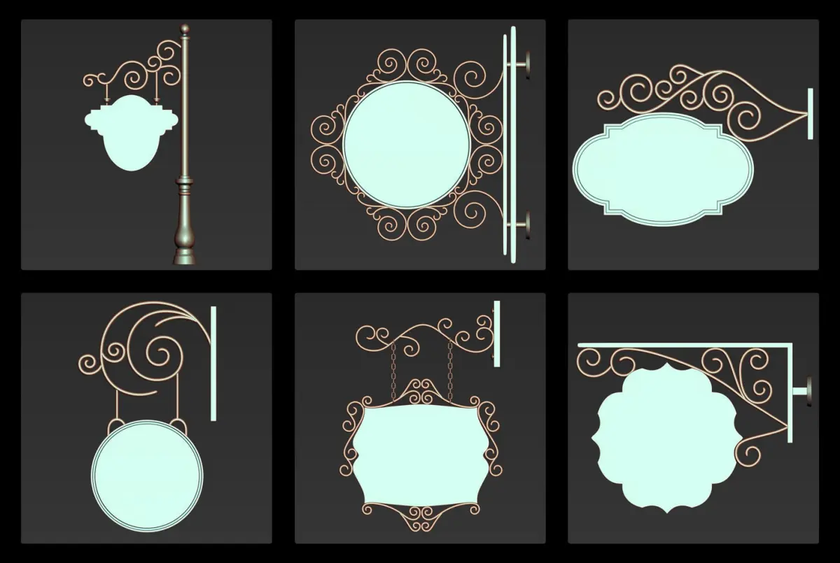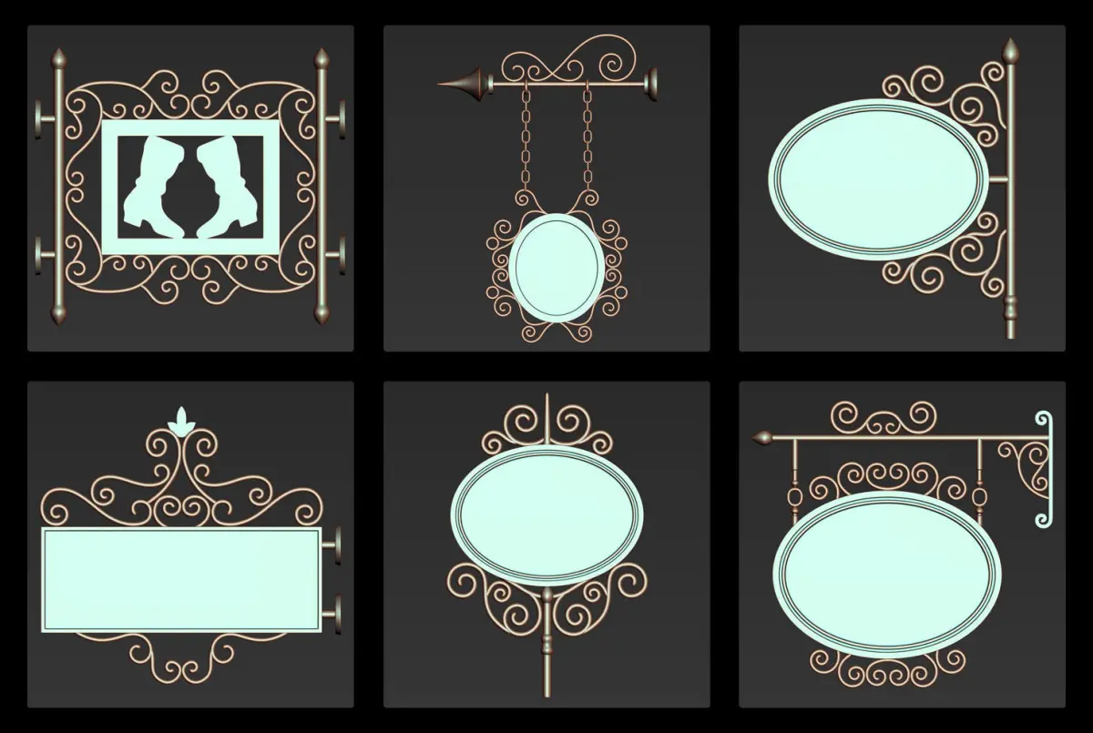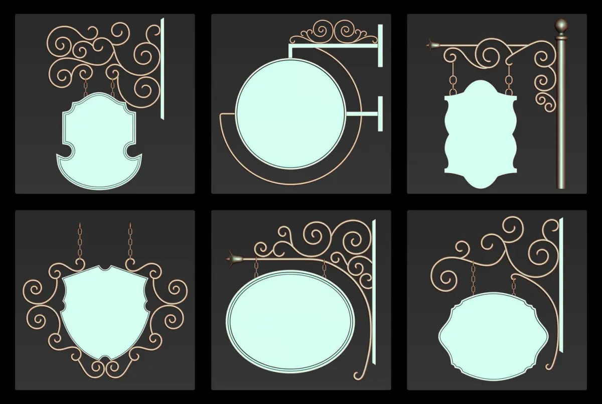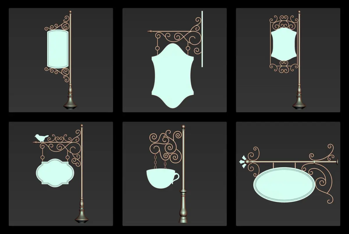 This pack includes 30 iron hanging sign board 3d models as a base and high mesh to add more detail in your 3d projects.