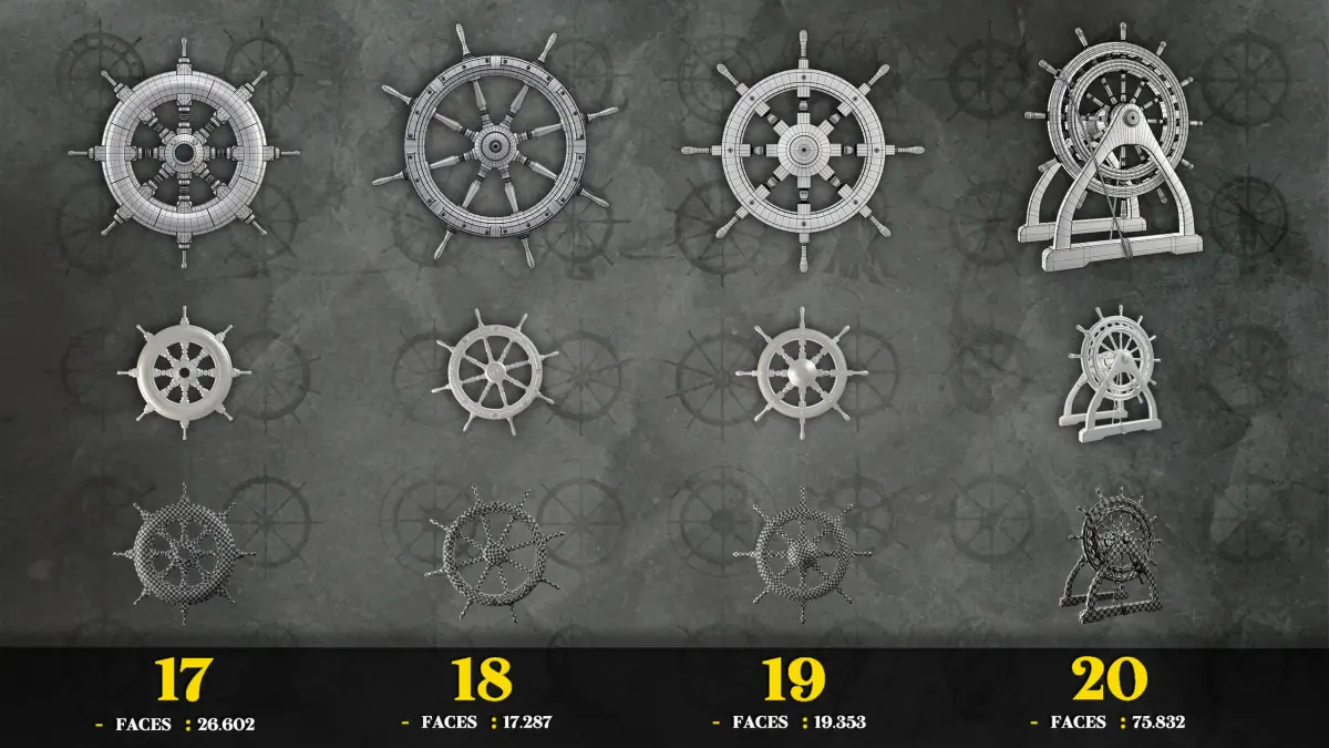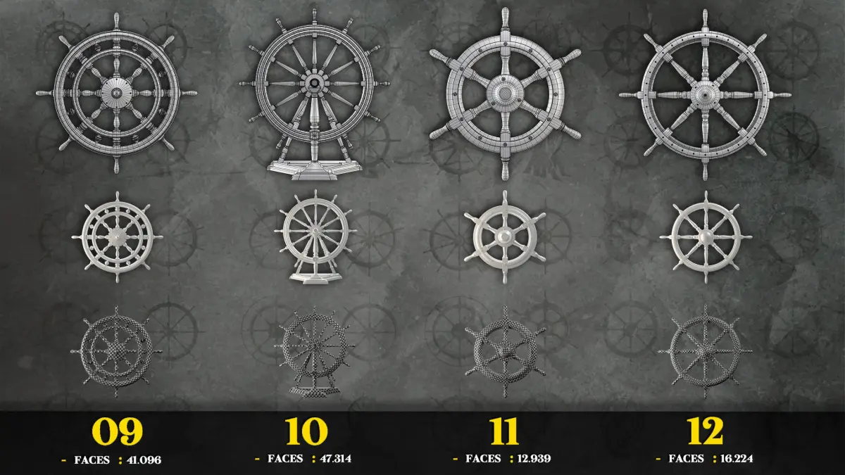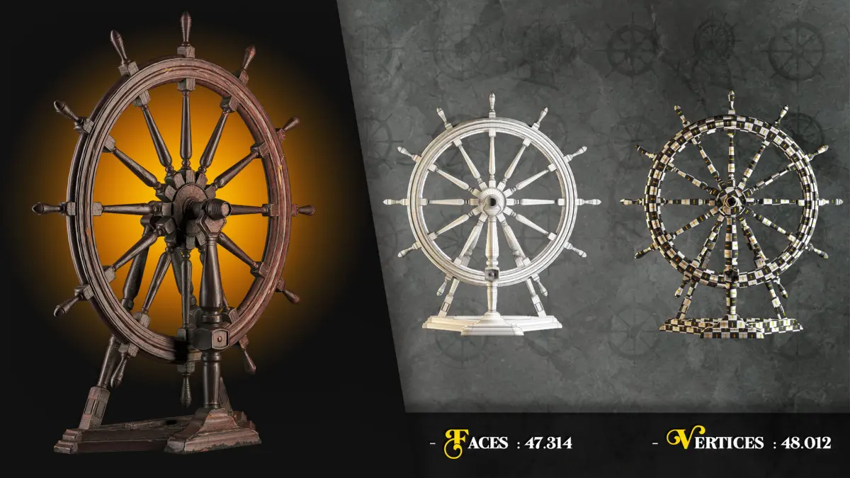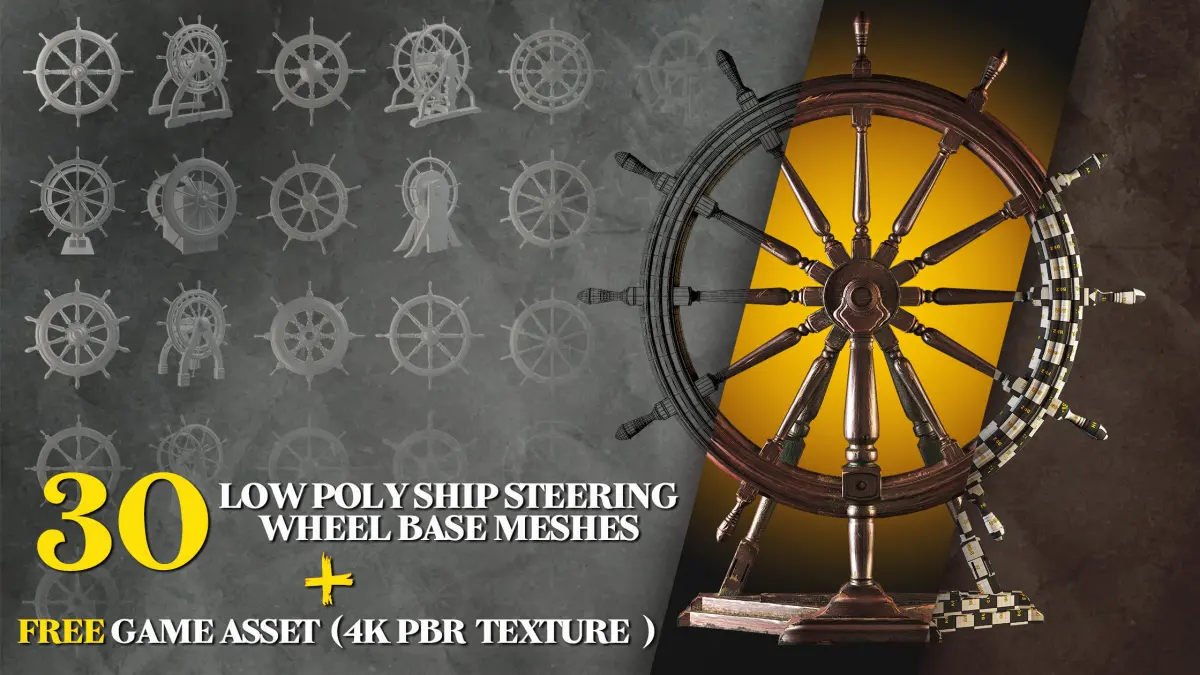 Hey GuysThis Product Includes 30 Low Poly Base Mesh of Ship Steering Wheels +1 Low Poly Game Asset With 4K PBR TexturesAll Base Meshes Have Clean Topology And UV Which You Can See In PDF And PostersThere Are FBX, OBJ And Blend files For Base MeshesThe Game Asset is Also Ready To Use In Vray5 And Corona5 (+FBX And 4K PBR Textures)Software Used : Blender - Unfold 3d - Substance Painter - Vray - 3dmaxIf you Have Any Question About This Product, Just Ask Us
