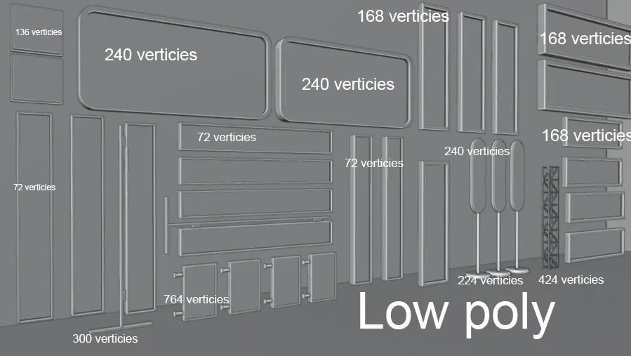 Sign poly counts :72 verts, 136 verts, 168 verts, 240 verts, 764 verts,