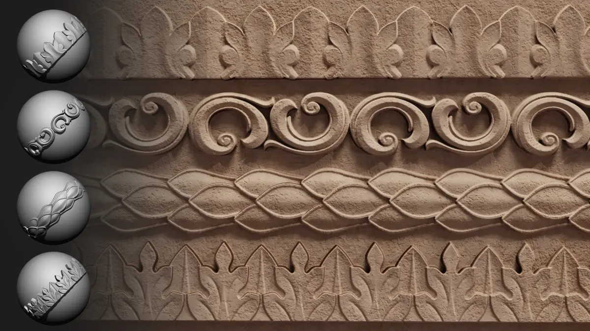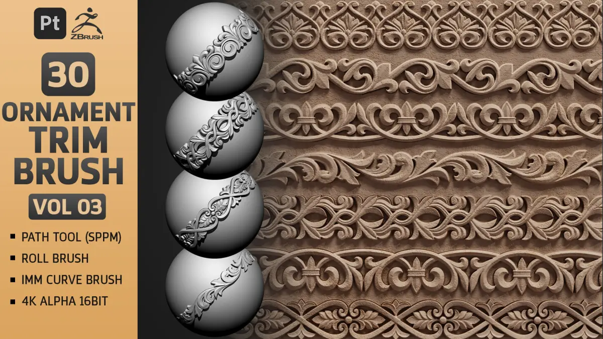 - 30 Roll Brushes for ZBrush – Sculpt ornament trims easily and precisely.