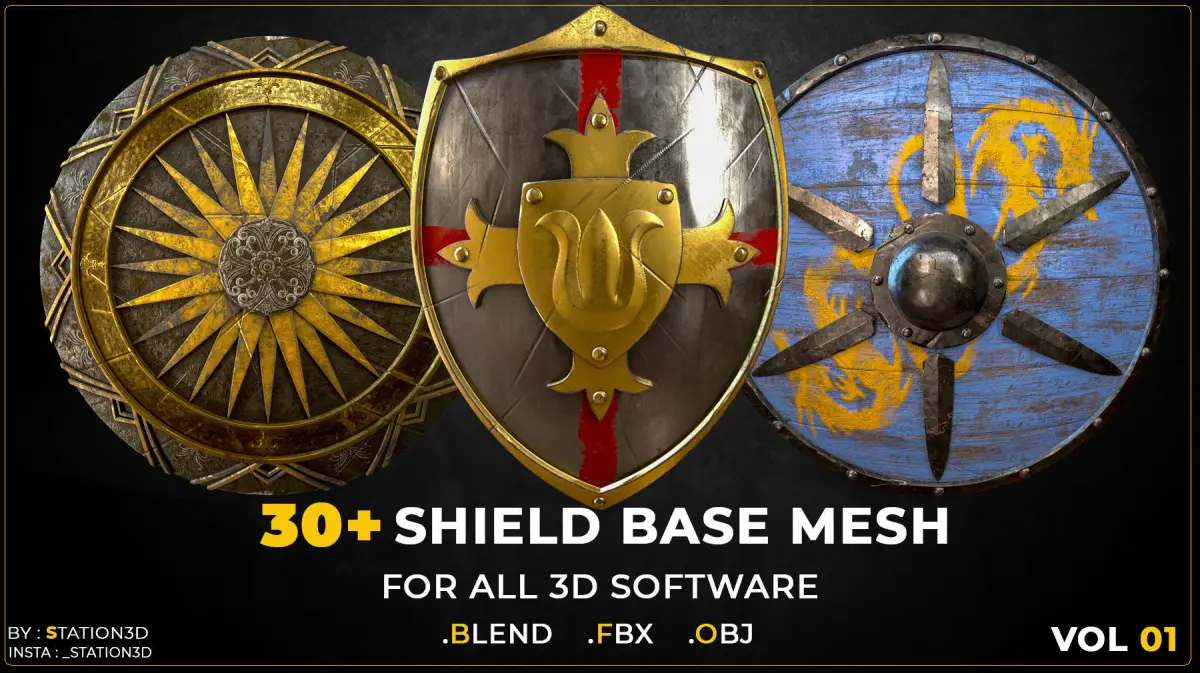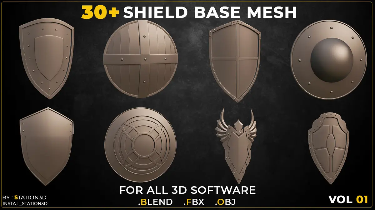 -30 Shield Base Mesh - Vol 01 (Game Ready)-.FBX-.OBJ-.Blend-Render Previews-Ready for the baking process-Clean 2 UV Channel-Clean Topology-All models are under 10,000 Triangle