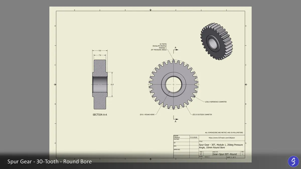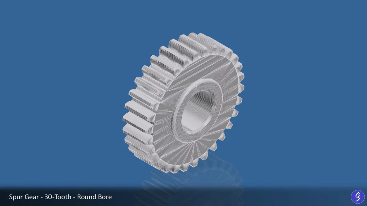 30-tooth spur gear, provided with multiple bore styles, accurately modeled and ready for use in CAD, CGI, and 3D print applications. Modeled in Autodesk Inventor and provided in multiple file formats. Perfect for both digital and physical mechanical design projects.