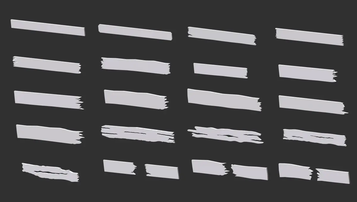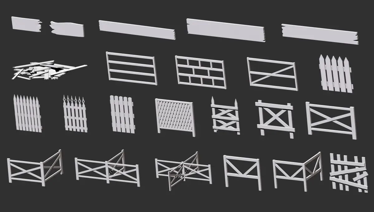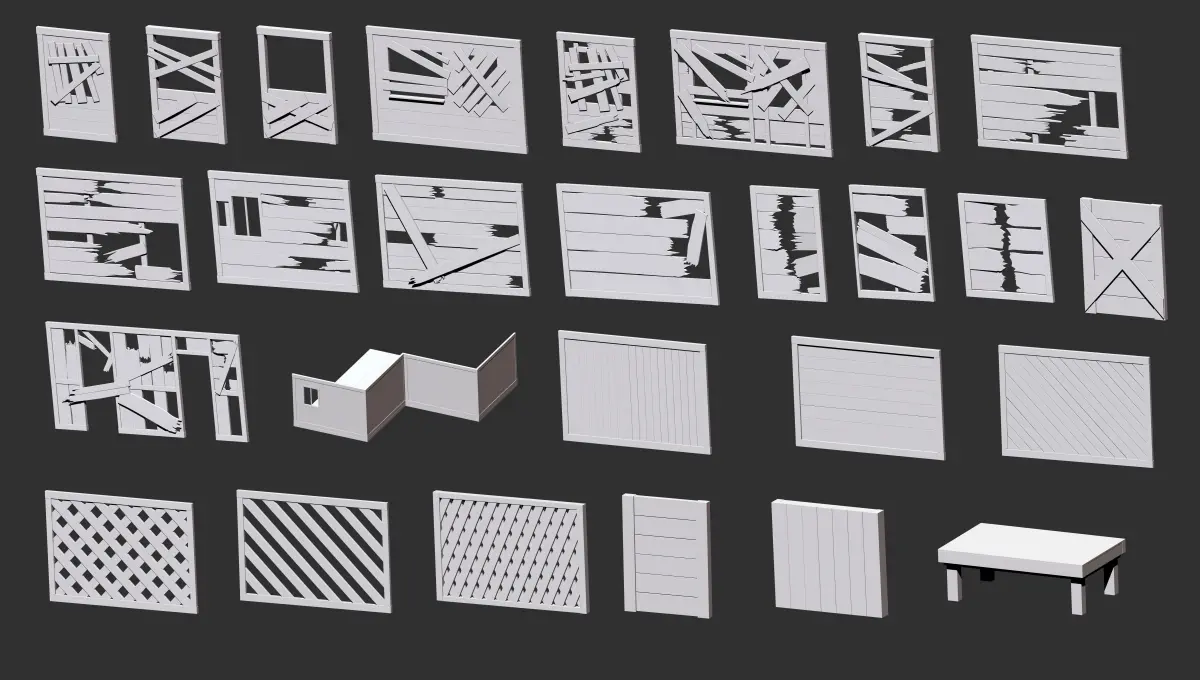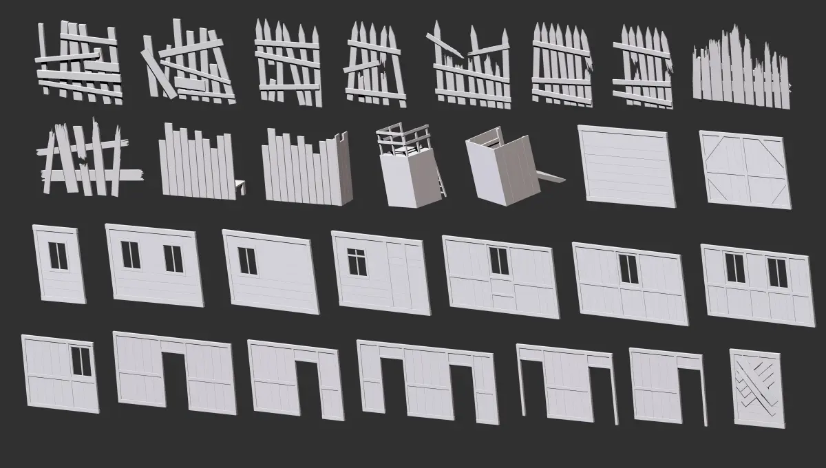 300 Low-poly wooden shed, house or farm cabin parts and elements kitbash IMM Zbrush brush set, obj and fbx files.