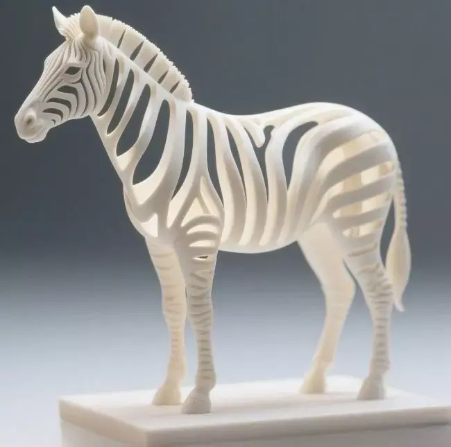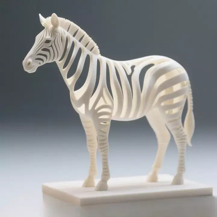3D model of an African zebra, crafted in minimalist style as a hollow sculpture with open cutouts in place of the white stripes. Light filters through the slits in the body, giving the piece an airy, artistic character. Designed to resemble carved ivory, it stands on a clean pedestal with a neutral background—ideal for display or symbolic art printing.
