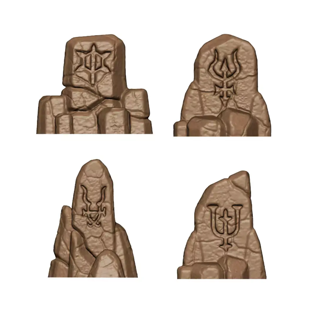 The pack includes 15 unique basing elements, featuring cracked demonic temple floor sections, jagged ritual stones, small shrine-like stone clusters, and eerie candles that instantly sell the idea of forbidden rites and corrupted ground. Each piece is sized and shaped to sit naturally on standard 32 mm bases without overpowering your miniature.