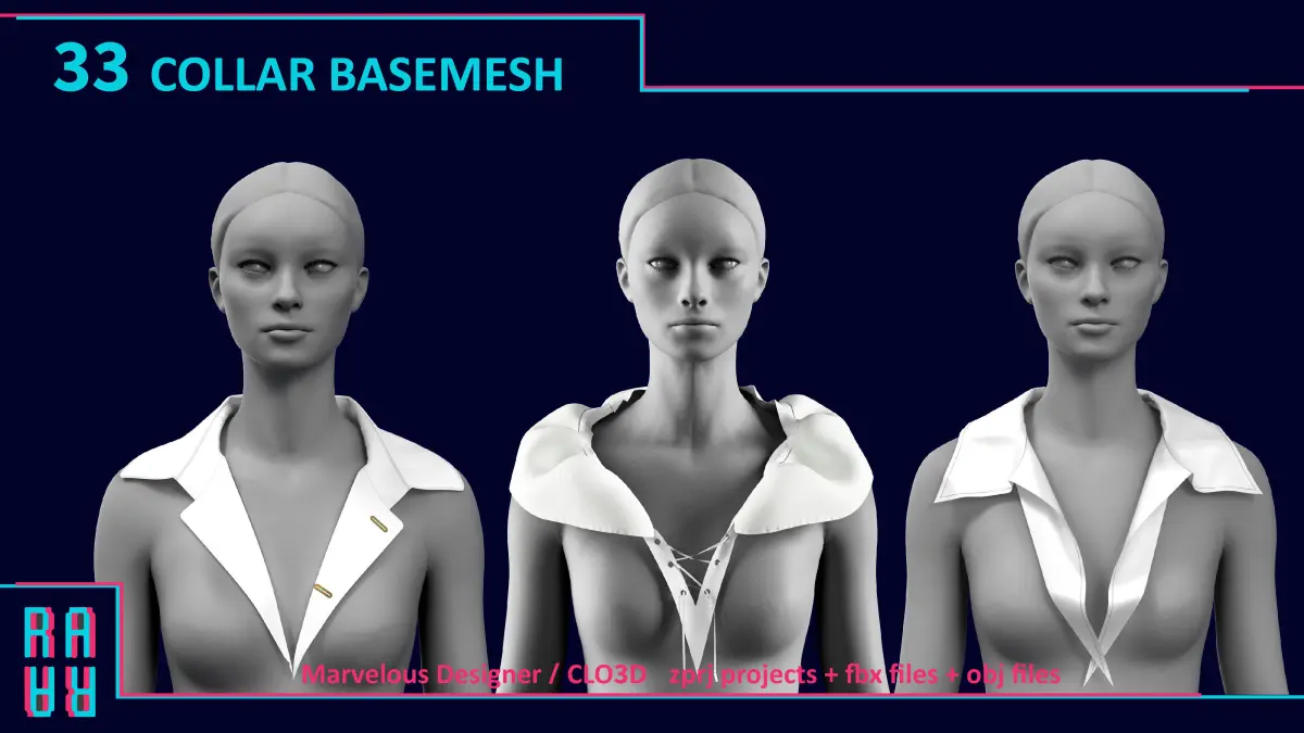 19 COLLAR 3D MODELS FOR FEMALE CREATED IN Marvelous Designer / CLO3D SUITABLE FOR WOMEN (PROJECT FILES:ZPRJ,OBJ,FBX )(QUAD MESH +UV)