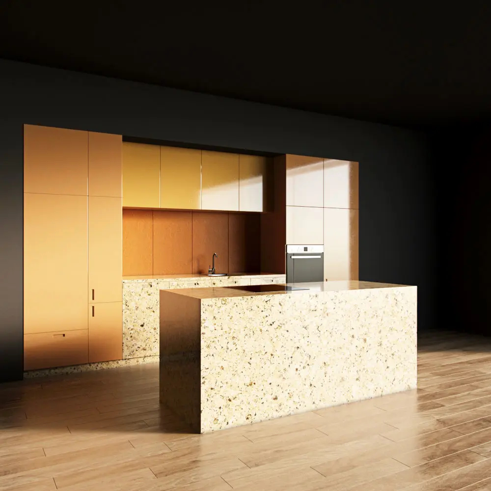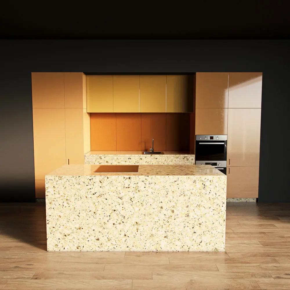 Only the kitchen and the island are present in the scene. The floor, walls, ceiling are yours.