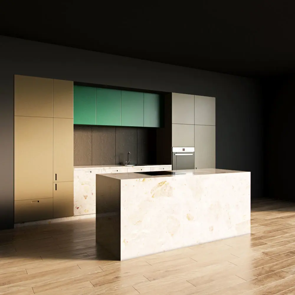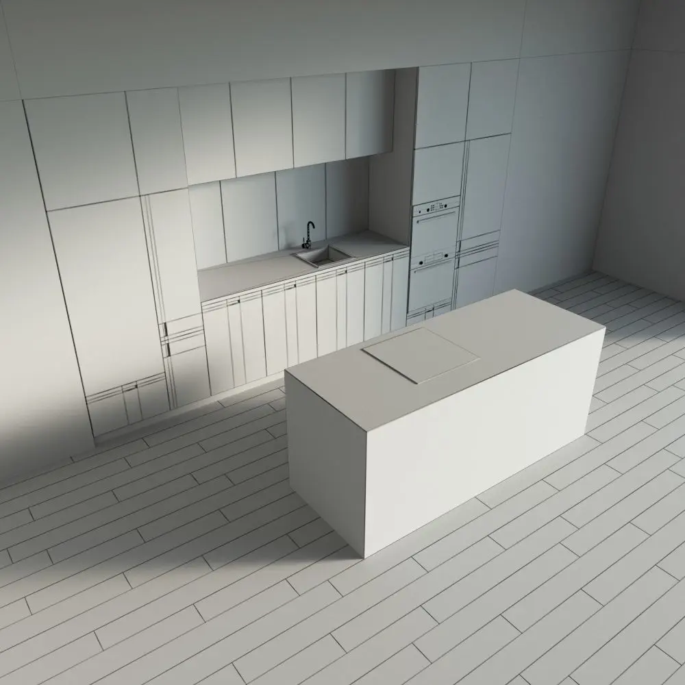 Only the kitchen and the island are present in the scene. The floor, walls, ceiling are yours.