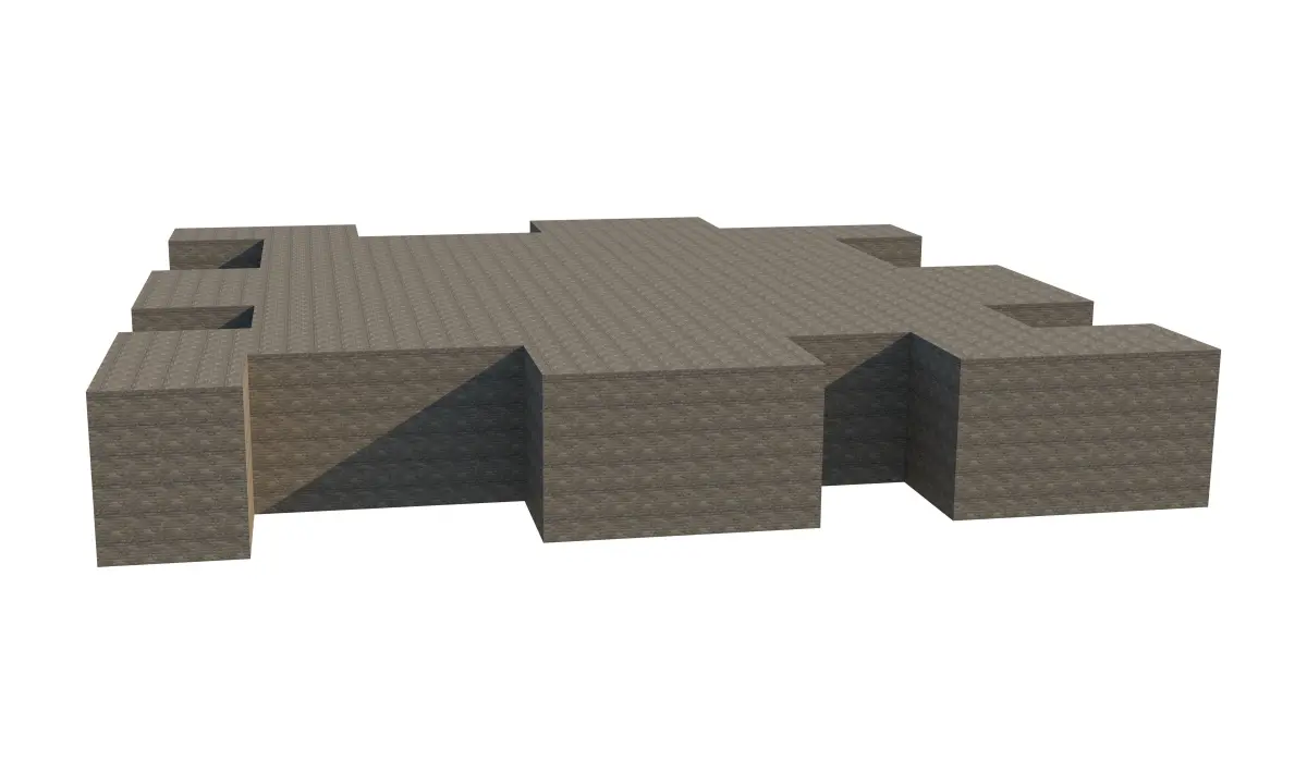 The solid presents a complex geometric shape, similar to a three-dimensional puzzle piece.The piece is isolated against a white background, allowing its shape and details to be clearly appreciated.The isometric perspective used facilitates the simultaneous viewing of the piece from different angles.Its design could have applications in construction, game design, or industrial prototyping.It is a 34-edged solid.