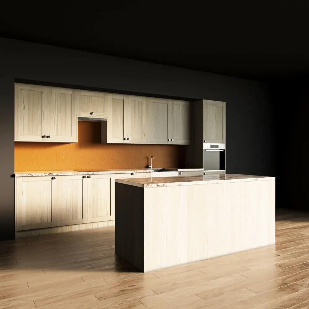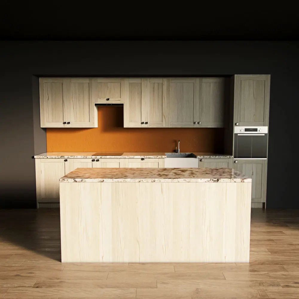 Only the kitchen and the island are present in the scene. The floor, walls, ceiling are yours.