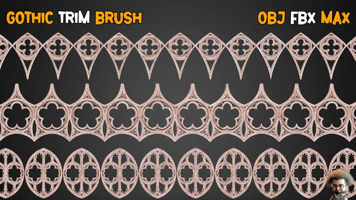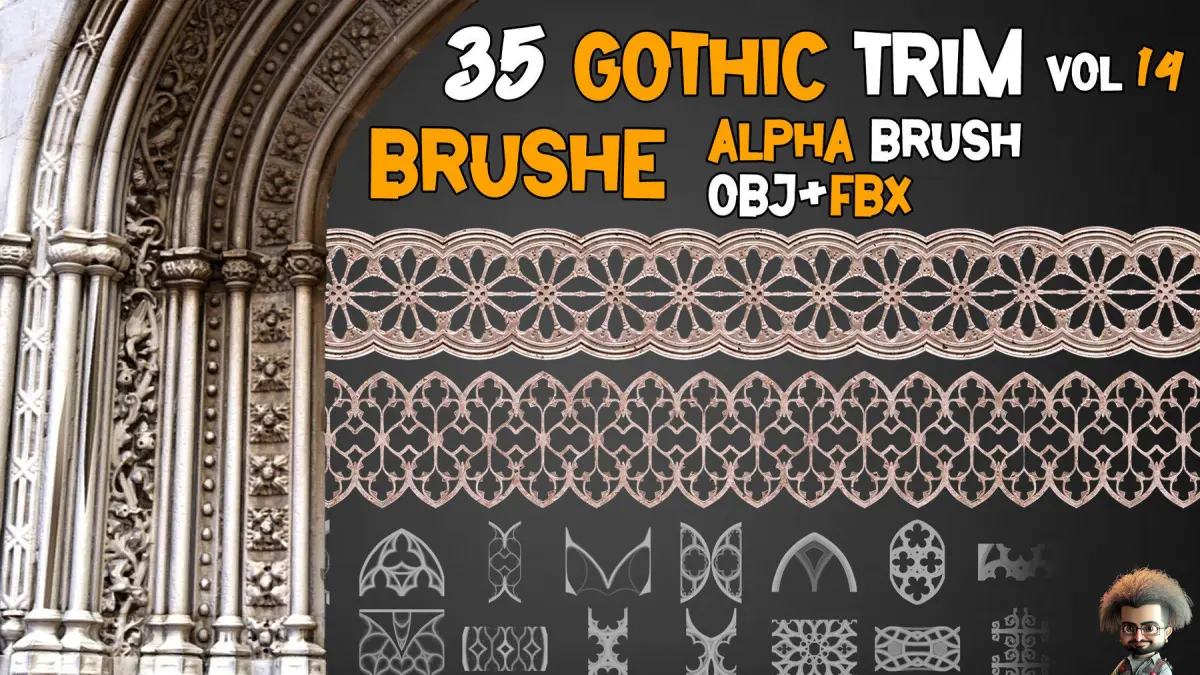 35 Gothic Trim Brushes 3D models16 BitZbrush Brush , IMM ,PSD , PNG , TIF, OBJ , FBX , MAX ,PDF (preview)Unwrapped3D Models OBJ-FBX-Max File(2018).
