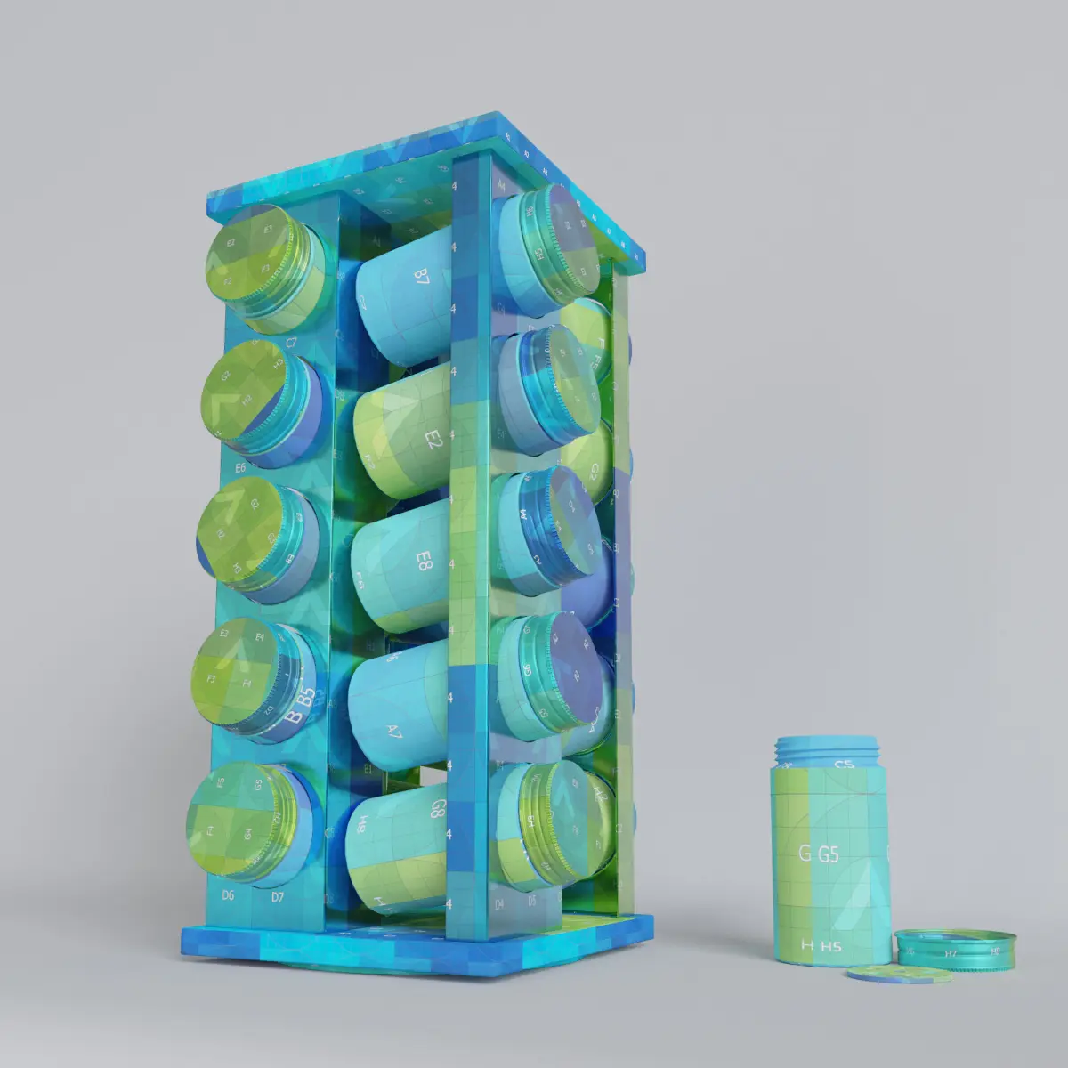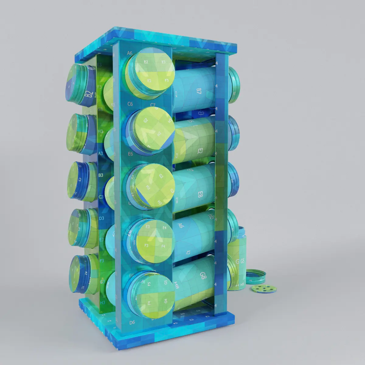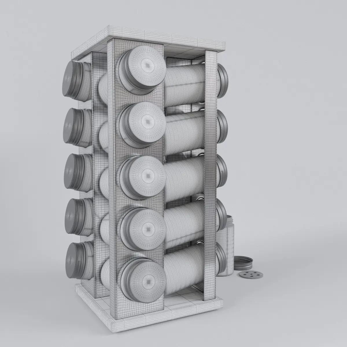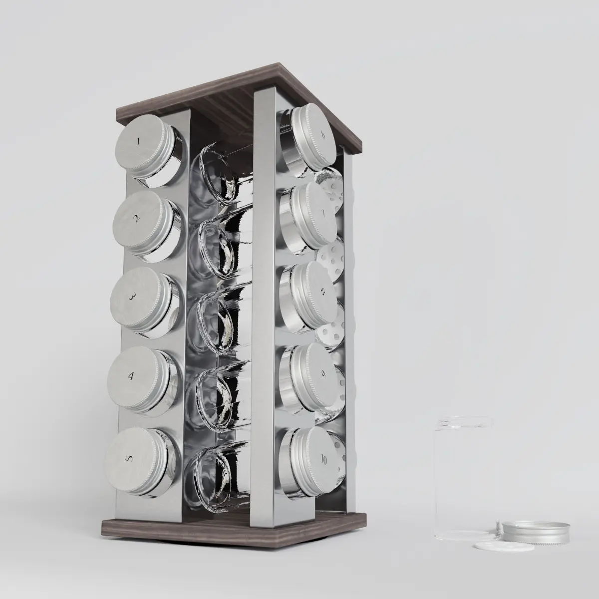 The asset is a 360° spice rack. It was modeled after a real one. Dimensions: 11.93'' x 5.31'' x 5.31'' / 30.3 cm x 13,5 cm x 13,5 cm. All materials are Vray Materials and have a PBR workflow (BaseColor, Normal, Roughness and Metalness). The jars' glass also have a refraction map. All objects were unwrapped with no overlapping UVs and straighten as much as possible. The asset is conformed by 5 objects (Frame, Rotating Base, jars, jar lids and jar sifters) collapsed to editpolys with a high subdivision. It was modeled with an effort to recreate details. Also on the side there's an open jar as a sample. Each jar lid has a number so it can be easily identified on the texture to rename as needed. There's 2 BaseColor textures provided, one with the numbers as a guide and another clean to be edited with your own labels. The scene has been cleared from lights and cameras.