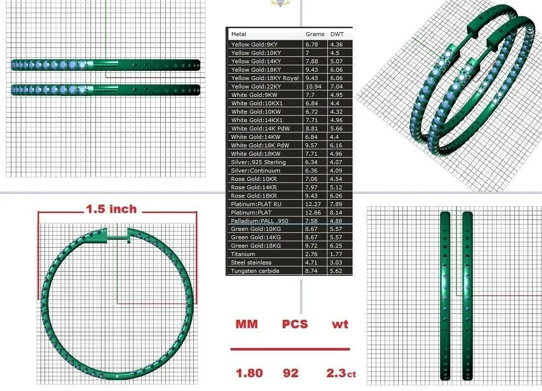 Diamond Jewelry 38mm U Pave Inside-Outside Diamond Hoop Earrings, Functional 3d Model of Diamond Jewelry, Fine Jewelry earrings 3d print ready & ready to cast. 3d file made in Rhino & Matrix by expert jewelers & expert cad designers. Post is included1.8mm Diamonds & 1.5inch diameter Hoops2.3ct diamonds